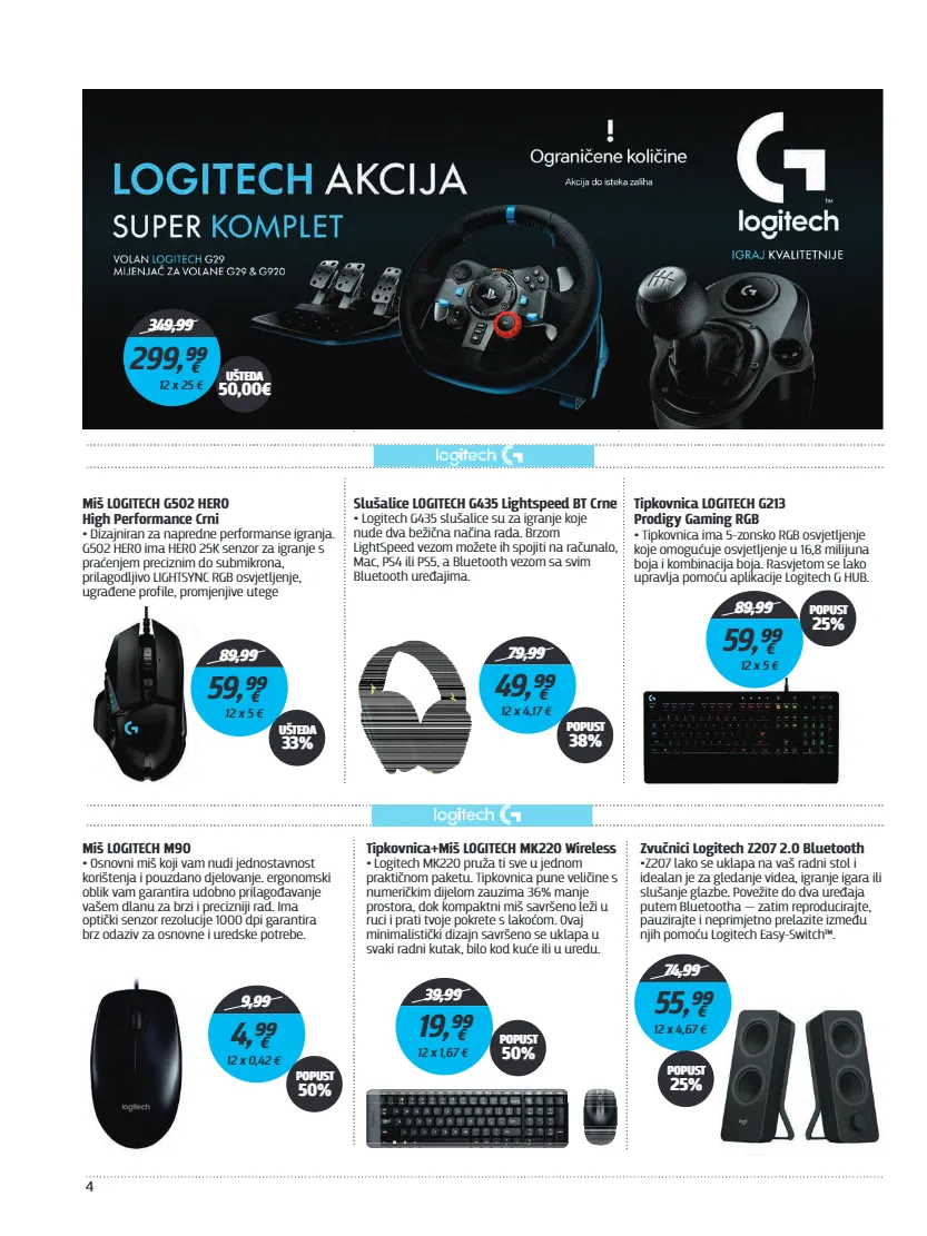 4 349,99 299,⁹⁹ € 12 x 25 € ušteda 50,00€ miš logitech g502 hero high performance crni dizajniran za napredne performanse igranja. • g502 hero ima hero 25k senzor za igranje s praćenjem preciznim do submikrona, prilagodljivo lightsync rgb osvjetljenje, ugrađene profile, promjenjive utege 89,99 59,⁹⁹ € 12 x 5 € ušteda 33% slušalice logitech g435 lightspeed bt crne logitech g435 slušalice su za igranje koje • nude dva bežična načina rada. brzom lightspeed vezom možete ih spojiti na računalo, mac, ps4 ili ps5, a bluetooth vezom sa svim bluetooth uređajima. 79,99 49,⁹⁹ € 12 x 4,17 € popust 38% tipkovnica logitech g213 prodigy gaming rgb tipkovnica ima 5-zonsko rgb osvjetljenje • koje omogućuje osvjetljenje u 16,8 milijuna boja i kombinacija boja. rasvjetom se lako upravlja pomoću aplikacije logitech g hub. 89,99 59,⁹⁹ € 12 x 5 € popust 25% miš logitech m90 osnovni miš koji vam nudi jednostavnost • korištenja i pouzdano djelovanje. ergonomski oblik vam garantira udobno prilagođavanje vašem dlanu za brzi i precizniji rad. ima optički senzor rezolucije 1000 dpi garantira brz odaziv za osnovne i uredske potrebe. 9,99 4,⁹⁹ € 12 x 0,42 € popust 50% tipkovnica+miš logitech mk220 wireless logitech mk220 pruža ti sve u jednom • praktičnom paketu. tipkovnica pune veličine s numeričkim dijelom zauzima 36% manje prostora, dok kompaktni miš savršeno leži u ruci i prati tvoje pokrete s lakoćom. ovaj minimalistički dizajn savršeno se uklapa u svaki radni kutak, bilo kod kuće ili u uredu. 39,99 19,⁹⁹ € 12 x 1,67 € popust 50% zvučnici logitech z207 2.0 bluetooth z207 lako se uklapa na vaš radni stol i • idealan je za gledanje videa, igranje igara ili slušanje glazbe. povežite do dva uređaja putem bluetootha — zatim reproducirajte, pauzirajte i neprimjetno prelazite između njih pomoću logitech easy-switch™. 74,99 55,⁹⁹ € 12 x 4,67 € popust 25%