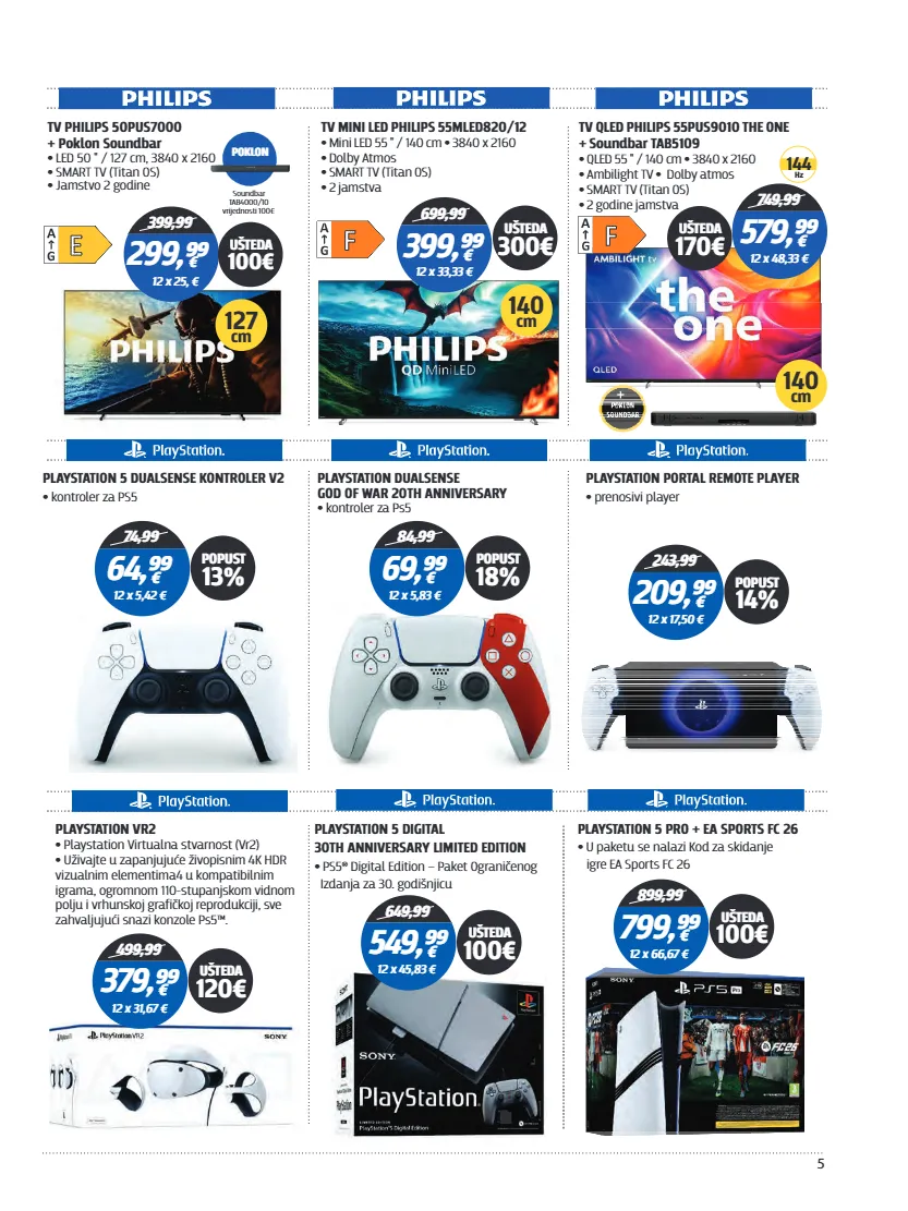 5 tv mini led philips 55mled820/12 • • mini led 55 " / 140 cm 3840 x 2160 dolby atmos • smart tv (titan os) • 2 jamstva • 699,99 399,⁹⁹ € 12 x 33,33 € 140 cm ušteda 300€ tv qled philips 55pus9010 the one + soundbar tab5109 • • qled 55 " / 140 cm 3840 x 2160 ambilight tv dolby atmos • • smart tv (titan os) • 2 godine jamstva • 140 cm 749,99 579,⁹⁹ € 12 x 48,33 € 144 hz ušteda 170€ tv philips 50pus7000 + poklon soundbar • led 50 " / 127 cm, 3840 x 2160 smart tv (titan os) • jamstvo 2 godine • 399,99 299,⁹⁹ € 12 x 25, € ušteda 100€ 127 cm soundbar tab4000/10 vrijednosti 100€ poklon playstation 5 dualsense kontroler v2 • kontroler za ps5 74,99 64,⁹⁹ € 12 x 5,42 € popust 13% playstation vr2 • playstation virtualna stvarnost (vr2) uživajte u zapanjujuće živopisnim 4k hdr • vizualnim elementima4 u kompatibilnim igrama, ogromnom 110-stupanjskom vidnom polju i vrhunskoj grafičkoj reprodukciji, sve zahvaljujući snazi konzole ps5™. 499,99 379,⁹⁹ € 12 x 31,67 € ušteda 120€ playstation 5 digital 30th anniversary limited edition • ps5® digital edition – paket ograničenog izdanja za 30. godišnjicu playstation 5 pro + ea sports fc 26 • u paketu se nalazi kod za skidanje igre ea sports fc 26 649,99 549,⁹⁹ € 12 x 45,83 € ušteda 100€ 899,99 799,⁹⁹ € 12 x 66,67 € ušteda 100€ playstation dualsense god of war 20th anniversary • kontroler za ps5 84,99 69,⁹⁹ € 12 x 5,83 € popust 18% 243,99 209,⁹⁹ € 12 x 17,50 € popust 14% playstation portal remote player • prenosivi player