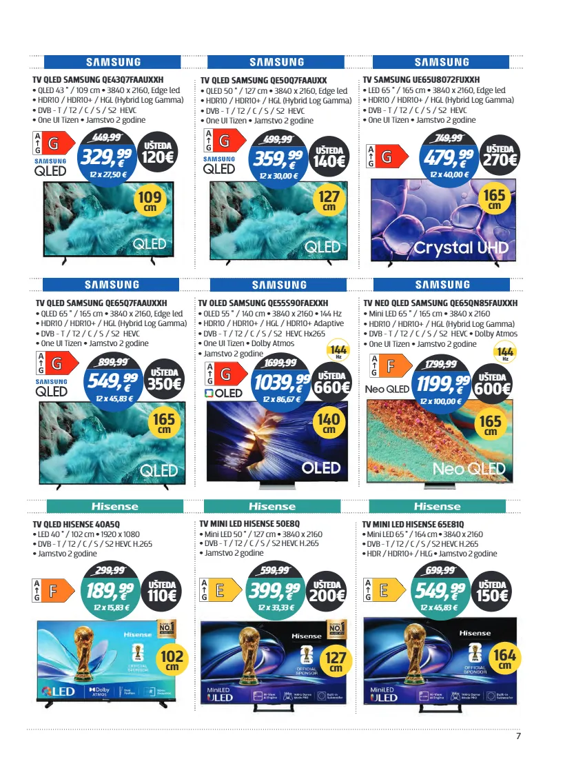 7 tv qled samsung qe43q7faauxxh • • qled 43 " / 109 cm 3840 x 2160, edge led hdr10 / hdr10+ / hgl (hybrid log gamma) • dvb - t / t2 / c / s / s2 hevc • one ui tizen jamstvo 2 godine • • 449,99 € 12 x 27,50 € 329,⁹⁹ ušteda 120€ 109 cm tv qled samsung qe65q7faauxxh • • qled 65 " / 165 cm 3840 x 2160, edge led hdr10 / hdr10+ / hgl (hybrid log gamma) • dvb - t / t2 / c / s / s2 hevc • one ui tizen jamstvo 2 godine • • tv qled samsung qe50q7faauxx • • qled 50 " / 127 cm 3840 x 2160, edge led hdr10 / hdr10+ / hgl (hybrid log gamma) • dvb - t / t2 / c / s / s2 hevc • one ui tizen jamstvo 2 godine • • 899,99 499,99 € € 12 x 45,83 € 12 x 30,00 € 549,⁹⁹ 359,⁹⁹ ušteda 350€ ušteda 140€ 165 cm 127 cm tv samsung ue65u8072fuxxh • • led 65 " / 165 cm 3840 x 2160, edge led hdr10 / hdr10+ / hgl (hybrid log gamma) • dvb - t / t2 / c / s / s2 hevc • one ui tizen jamstvo 2 godine • • 749,99 € 12 x 40,00 € 479,⁹⁹ ušteda 270€ 165 cm tv oled samsung qe55s90faexxh • • • oled 55 " / 140 cm 3840 x 2160 144 hz hdr10 / hdr10+ / hgl / hdr10+ adaptive • dvb - t / t2 / c / s / s2 hevc hx265 • one ui tizen dolby atmos • • jamstvo 2 godine • 140 cm 1699,99 € 12 x 86,67 € 1039,⁹⁹ ušteda 660€ 144 hz tv neo qled samsung qe65qn85fauxxh • • mini led 65 " / 165 cm 3840 x 2160 hdr10 / hdr10+ / hgl (hybrid log gamma) • dvb - t / t2 / c / s / s2 hevc dolby atmos • • one ui tizen jamstvo 2 godine • • 165 cm 1799,99 € 12 x 100,00 € 1199,⁹⁹ ušteda 600€ 144 hz tv qled hisense 40a5q • • led 40 " / 102 cm 1920 x 1080 dvb - t / t2 / c / s / s2 hevc h.265 • • jamstvo 2 godine 299,99 189,⁹⁹ € 12 x 15,83 € ušteda 110€ 102 cm tv mini led hisense 50e8q • • mini led 50 " / 127 cm 3840 x 2160 dvb - t / t2 / c / s / s2 hevc h.265 • • jamstvo 2 godine 599,99 399,⁹⁹ € 12 x 33,33 € ušteda 200€ 127 cm tv mini led hisense 65e81q • • mini led 65 " / 164 cm 3840 x 2160 dvb - t / t2 / c / s / s2 hevc h.265 • • • hdr / hdr10+ / hlg jamstvo 2 godine 699,99 549,⁹⁹ € 12 x 45,83 € ušteda 150€ 164 cm