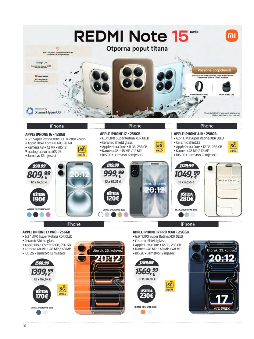 8 APPLE IPHONE 16 • 128GB • 6.1" Super Retina XDR OLED Dolby Vision Apple Hexa Core 8 GB, 128 GB • • Kamera 48 + 12 MP iOS 18 • • nadogradivo na iOS 26 * Jamstvo 12 mjeseci • 999,99 809,⁹⁹ € 12 x 67,50 € UŠTEDA 190€ OSTALE DOSTUPNE BOJE 1119,99 999,⁹⁹ € 12 x 83,33 € UŠTEDA 120€ OSTALE DOSTUPNE BOJE APPLE IPHONE 17 • 256GB • 6.3" LTPO Super Retina XDR OLED • Ceramic Shield glass Apple Hexa Core 8 GB, 256 GB • • Kamera 48 + 18 MP / 12 MP • • • iOS 26 Jamstvo 12 mjeseci 1329,99 1049,⁹⁹ € 12 x 87,55 € UŠTEDA 280€ OSTALE DOSTUPNE BOJE APPLE IPHONE AIR • 256GB • 6.5 " LTPO Super Retina XDR OLED • Ceramic Shield 2 Apple Hexa Core 12 GB, 256 GB • • Kamera 48 MP / 12 MP • • • iOS 26 Jamstvo 12 mjeseci 1569,99 1399,⁹⁹ € 12 x 116,67 € UŠTEDA 170€ APPLE IPHONE 17 PRO • 256GB • 6.3 " LTPO Super Retina XDR OLED • Ceramic Shield glass Apple Hexa Core 12 GB, 256 GB • • Kamera 48 MP + 48 MP / 48 MP • • • iOS 26 Jamstvo 12 mjeseci OSTALE DOSTUPNE BOJE APPLE IPHONE 17 PRO MAX • 256GB • 6.9 " LTPO Super Retina XDR OLED • Ceramic Shield glass Apple Hexa Core 12 GB, 256 GB • • Kamera 48 MP + 48 MP / 48 MP • • • iOS 26 Jamstvo 12 mjeseci 1799,99 1569,⁹⁹ € 12 x 130,83 € UŠTEDA 230€ OSTALE DOSTUPNE BOJE