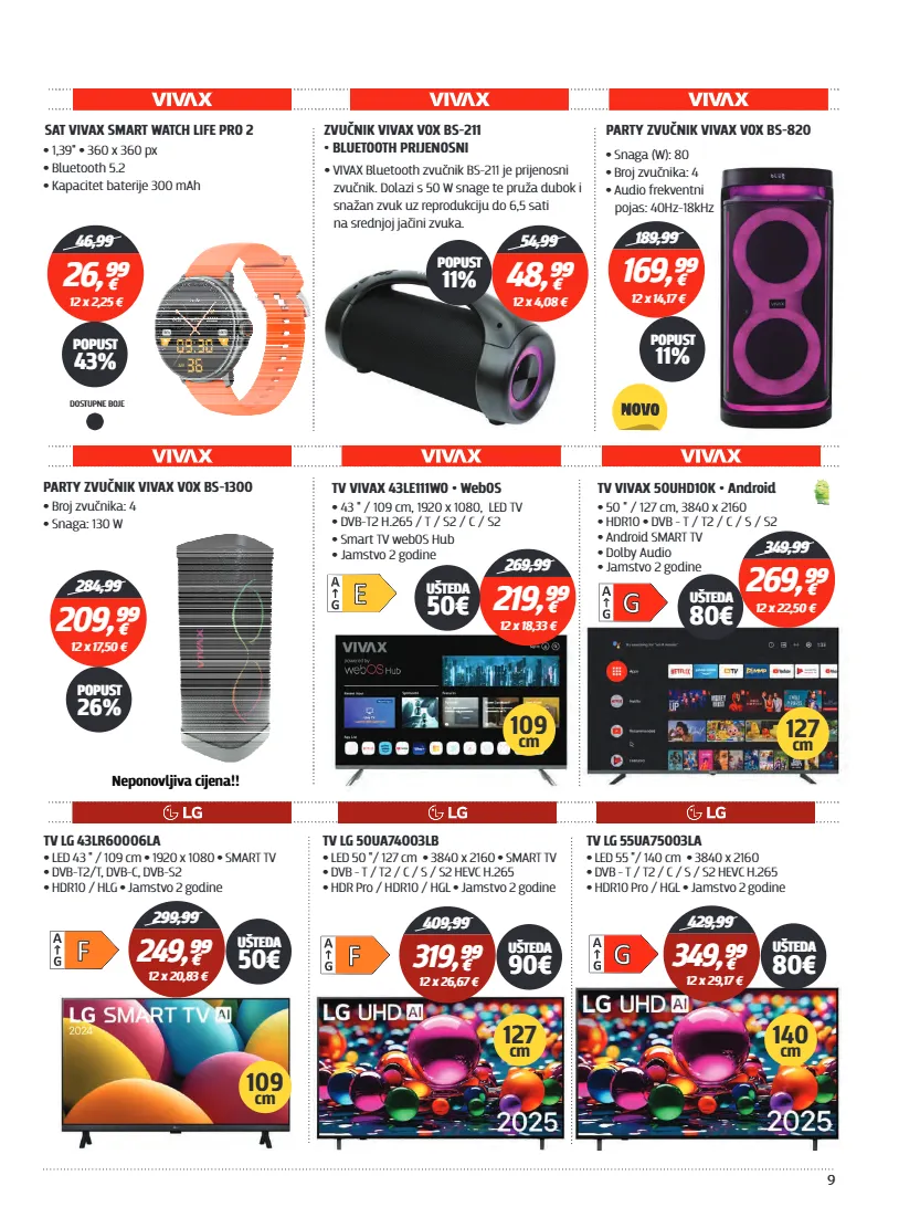 9 sat vivax smart watch life pro 2 46,99 12 x 2,25 € popust 43% • • 1,39" 360 x 360 px bluetooth 5.2 • kapacitet baterije 300 mah • dostupne boje party zvučnik vivax vox bs-1300 • broj zvučnika: 4 snaga: 130 w • neponovljiva cijena!! 284,99 12 x 17,50 € popust 26% 26,⁹⁹ € 209,⁹⁹ € zvučnik vivax vox bs-211 • bluetooth prijenosni 54,99 12 x 4,08 € popust 11% • vivax bluetooth zvučnik bs-211 je prijenosni zvučnik. dolazi s 50 w snage te pruža dubok i snažan zvuk uz reprodukciju do 6,5 sati na srednjoj jačini zvuka. 48,⁹⁹ € party zvučnik vivax vox bs-820 • snaga (w): 80 broj zvučnika: 4 • audio frekventni • pojas: 40hz-18khz 189,99 12 x 14,17 € popust 11% 169,⁹⁹ € tv vivax 43le111wo • webos • 43 " / 109 cm, 1920 x 1080, led tv dvb-t2 h.265 / t / s2 / c / s2 • • smart tv webos hub jamstvo 2 godine • tv vivax 50uhd10k • android • 50 " / 127 cm, 3840 x 2160 hdr10 dvb - t / t2 / c / s / s2 • • android smart tv • dolby audio • jamstvo 2 godine • 269,99 12 x 18,33 € 219,⁹⁹ € 349,99 12 x 22,50 € popust 11% 269,⁹⁹ € ušteda 50€ ušteda 80€ tv lg 43lr60006la • • • led 43 " / 109 cm 1920 x 1080 smart tv dvb-t2/t, dvb-c, dvb-s2 • hdr10 / hlg jamstvo 2 godine • • 299,99 249,⁹⁹ € 12 x 20,83 € ušteda 50€ 109 cm tv lg 50ua74003lb • • • led 50 "/ 127 cm 3840 x 2160 smart tv dvb - t / t2 / c / s / s2 hevc h.265 • hdr pro / hdr10 / hgl jamstvo 2 godine • • 409,99 319,⁹⁹ € 12 x 26,67 € ušteda 90€ 127 cm tv lg 55ua75003la • • led 55 "/ 140 cm 3840 x 2160 dvb - t / t2 / c / s / s2 hevc h.265 • hdr10 pro / hgl jamstvo 2 godine • • 429,99 349,⁹⁹ € 12 x 29,17 € ušteda 80€ 140 cm 109 cm 127 cm