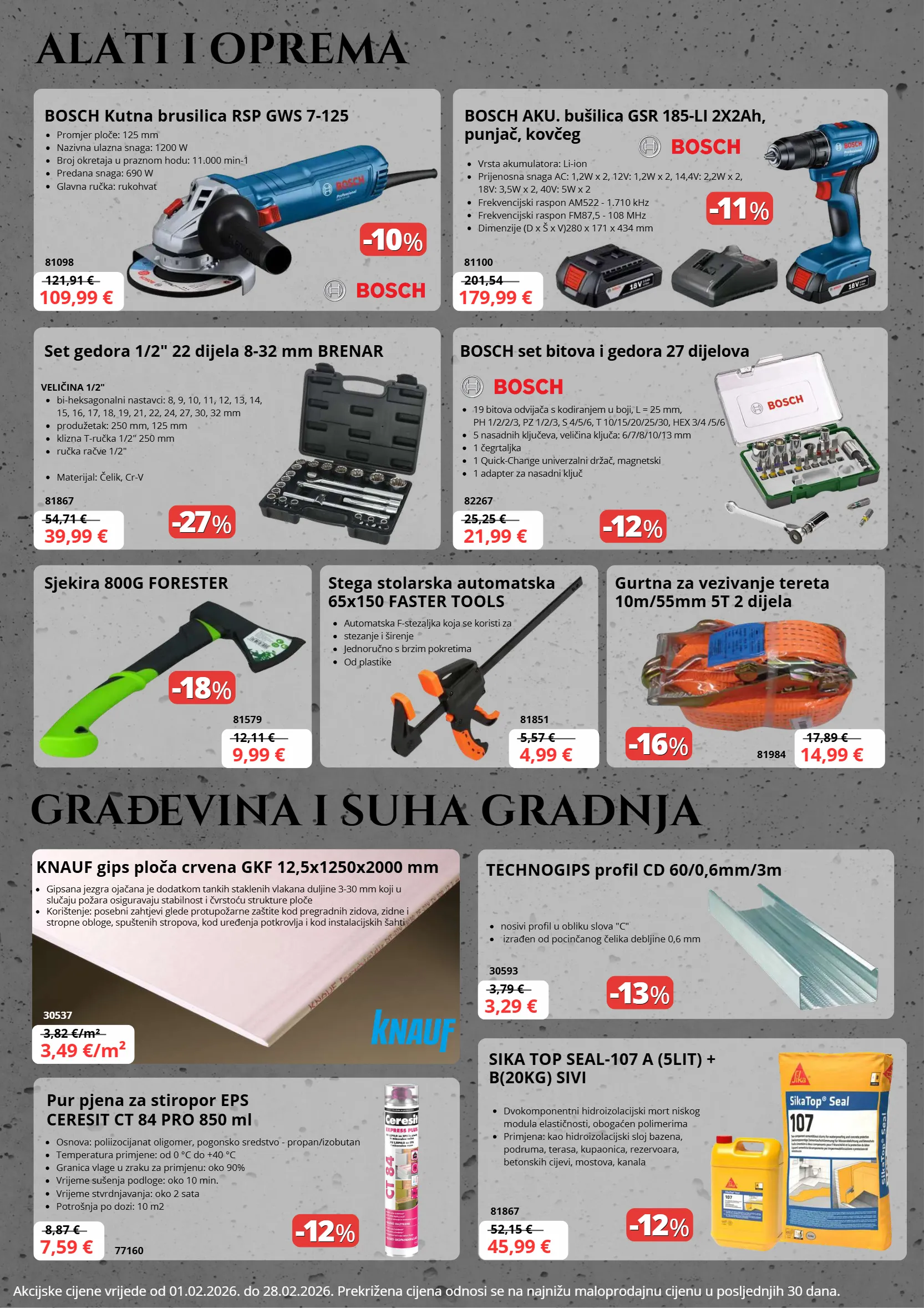 -10 -10 % % -27 -27 % % -18 -18 % % -11 -11 % % -12 -12 % % -16 -16 % % -13 -13 % % -12 -12 % % -12 -12 % % dvokomponentni hidroizolacijski mort niskog modula elastičnosti, obogaćen polimerima primjena: kao hidroizolacijski sloj bazena, podruma, terasa, kupaonica, rezervoara, betonskih cijevi, mostova, kanala 121,91 € 54,71 € 12,11 € 5,57 € 17,89 € 201,54 25,25 € 3,82 €/m² 52,15 € 3,79 € 8,87 € sika top seal-107 a (5lit) + b(20kg) sivi 30537 81867 30593 77160 3,49 €/m² 45,99 € 3,29 € 7,59 € 19 bitova odvijača s kodiranjem u boji, l = 25 mm, ph 1/2/2/3, pz 1/2/3, s 4/5/6, t 10/15/20/25/30, hex 3/4 /5/6 5 nasadnih ključeva, veličina ključa: 6/7/8/10/13 mm 1 čegrtaljka 1 quick-change univerzalni držač, magnetski 1 adapter za nasadni ključ automatska f-stezaljka koja se koristi za stezanje i širenje jednoručno s brzim pokretima od plastike bosch kutna brusilica rsp gws 7-125 set gedora 1/2" 22 dijela 8-32 mm brenar sjekira 800g forester stega stolarska automatska 65x150 faster tools gurtna za vezivanje tereta 10m/55mm 5t 2 dijela promjer ploče: 125 mm nazivna ulazna snaga: 1200 w broj okretaja u praznom hodu: 11.000 min-1 predana snaga: 690 w glavna ručka: rukohvat veličina 1/2" bi-heksagonalni nastavci: 8, 9, 10, 11, 12, 13, 14, 15, 16, 17, 18, 19, 21, 22, 24, 27, 30, 32 mm produžetak: 250 mm, 125 mm klizna t-ručka 1/2" 250 mm ručka račve 1/2" materijal: čelik, cr-v alati i oprema bosch aku. bušilica gsr 185-li 2x2ah, punjač, kovčeg bosch set bitova i gedora 27 dijelova vrsta akumulatora: li-ion prijenosna snaga ac: 1,2w x 2, 12v: 1,2w x 2, 14,4v: 2,2w x 2, 18v: 3,5w x 2, 40v: 5w x 2 frekvencijski raspon am522 - 1.710 khz frekvencijski raspon fm87,5 - 108 mhz dimenzije (d x š x v)280 x 171 x 434 mm akcijske cijene vrijede od 01.02.2026. do 28.02.2026. prekrižena cijena odnosi se na najnižu maloprodajnu cijenu u posljednjih 30 dana. 81098 81867 81579 81851 81984 81100 82267 109,99 € 39,99 € 9,99 € 4,99 € 14,99 € 179,99 € 21,99 € gra đ evina i suha gradnja gipsana jezgra ojačana je dodatkom tankih staklenih vlakana duljine 3-30 mm koji u slučaju požara osiguravaju stabilnost i čvrstoću strukture ploče korištenje: posebni zahtjevi glede protupožarne zaštite kod pregradnih zidova, zidne i stropne obloge, spuštenih stropova, kod uređenja potkrovlja i kod instalacijskih šahti nosivi profil u obliku slova "c" izrađen od pocinčanog čelika debljine 0,6 mm osnova: poliizocijanat oligomer, pogonsko sredstvo - propan/izobutan temperatura primjene: od 0 °c do +40 °c granica vlage u zraku za primjenu: oko 90% vrijeme sušenja podloge: oko 10 min. vrijeme stvrdnjavanja: oko 2 sata potrošnja po dozi: 10 m2 knauf gips ploča crvena gkf 12,5x1250x2000 mm technogips profil cd 60/0,6mm/3m pur pjena za stiropor eps ceresit ct 84 pro 850 ml