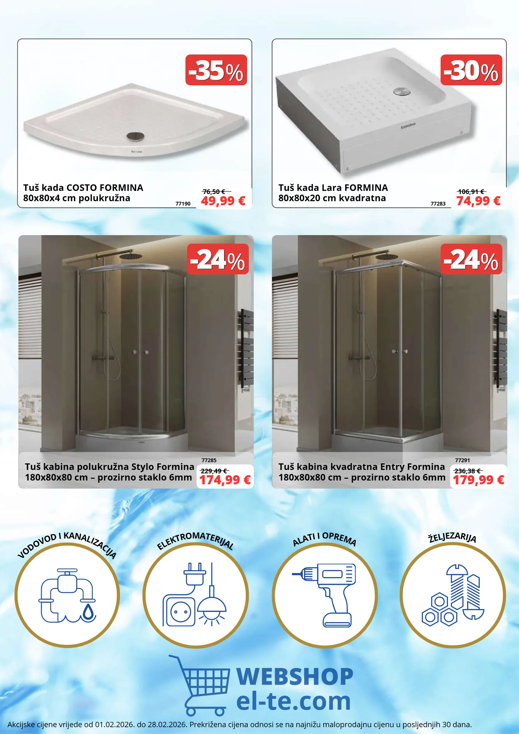 -35 -35 % % -24 -24 % % -24 -24 % % 76,50 € 229,49 € 236,38 € -30 -30 % % 106,91 € WEBSHOP el-te.com E L E K T R O M A T E R I J A L A L A T I I O P R E M A Ž E L J E Z A R I J A V O D O V O D I K A N A L I Z A C I J A Tuš kada COSTO FORMINA 80x80x4 cm polukružna Tuš kabina polukružna Stylo Formina 180x80x80 cm – prozirno staklo 6mm Tuš kabina kvadratna Entry Formina 180x80x80 cm – prozirno staklo 6mm 49,99 € 174,99 € 179,99 € 77190 77285 77291 Tuš kada Lara FORMINA 80x80x20 cm kvadratna 74,99 € 77283 Akcijske cijene vrijede od 01.02.2026. do 28.02.2026. Prekrižena cijena odnosi se na najnižu maloprodajnu cijenu u posljednjih 30 dana.