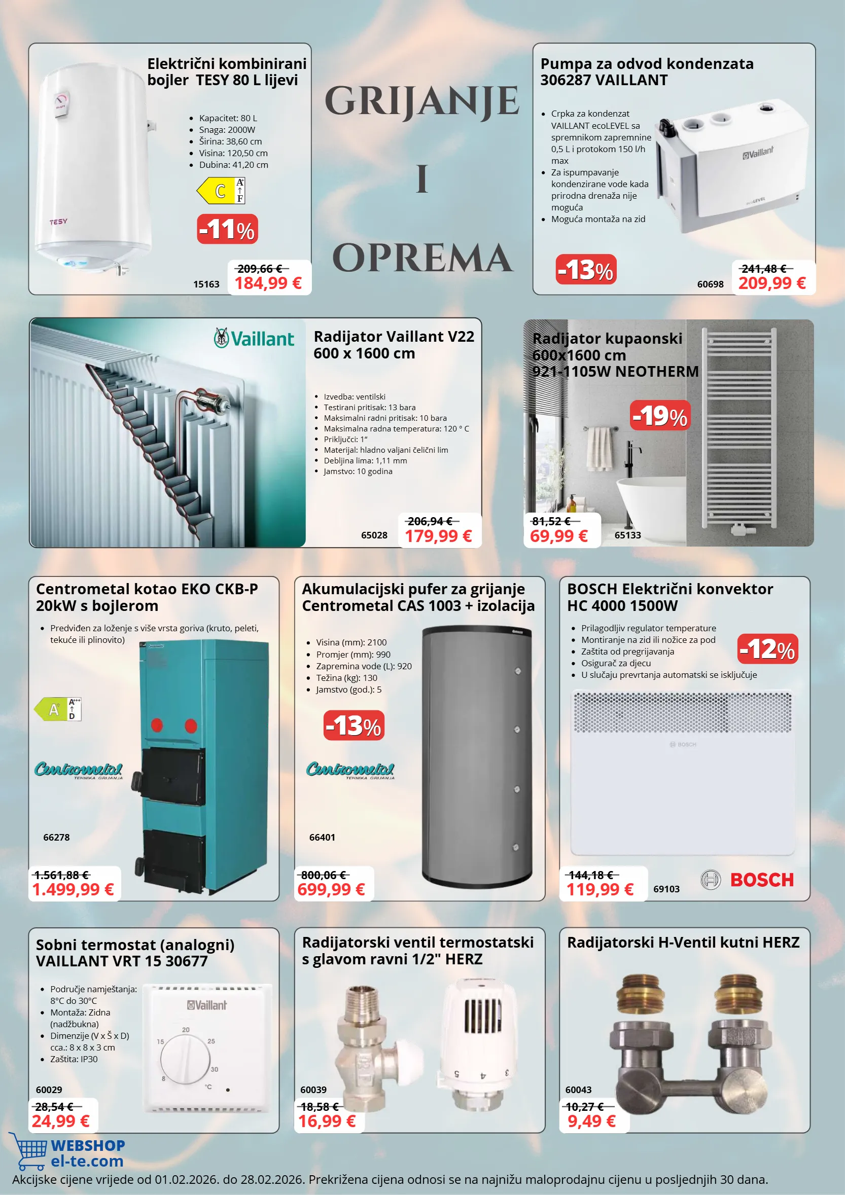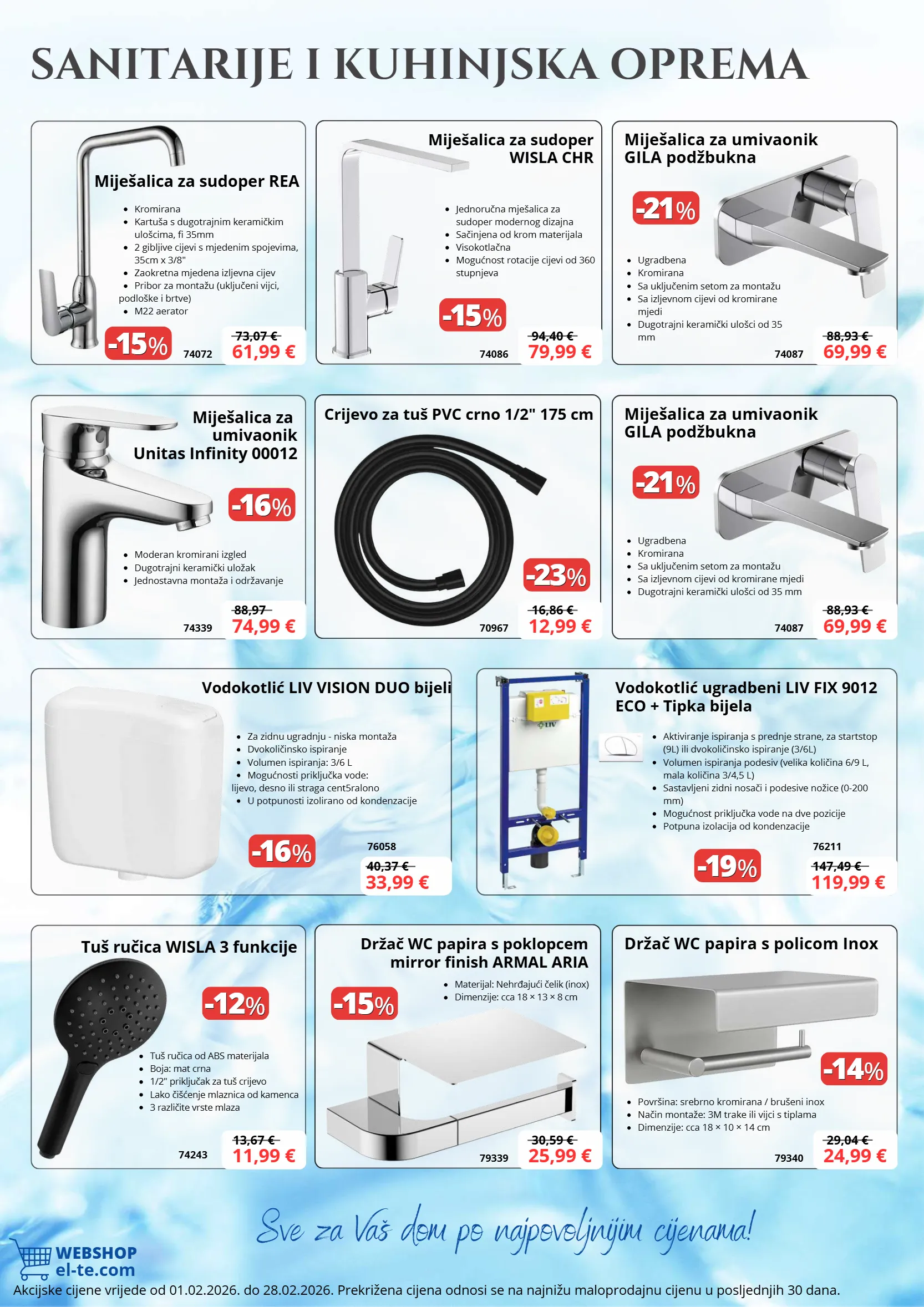 Ulica Nikole Tesle 16 48260 Križevci 048/682-789 info@el-te.com www.el-te.com EL-TE Trgovina RADNO VRIJEME: Radnim danom 07:00 - 19:30 Subotom 07:00 - 13:00 Napomena: Zadržavamo pravo na tiskarske i druge pogreške kao i promjene modela. Fotografije su simbolične i ne moraju odgovarati stvarnom izgledu proizvoda. Ponuda vrijedi od 01.02.2026. do 28.02.2026. ili do isteka zaliha. Cijene su iskazane u eurima s uključenim PDV-om. Cijene u katalogu vrijede isključivo za navedene šifre artikala i za sve vrste plaćanja.