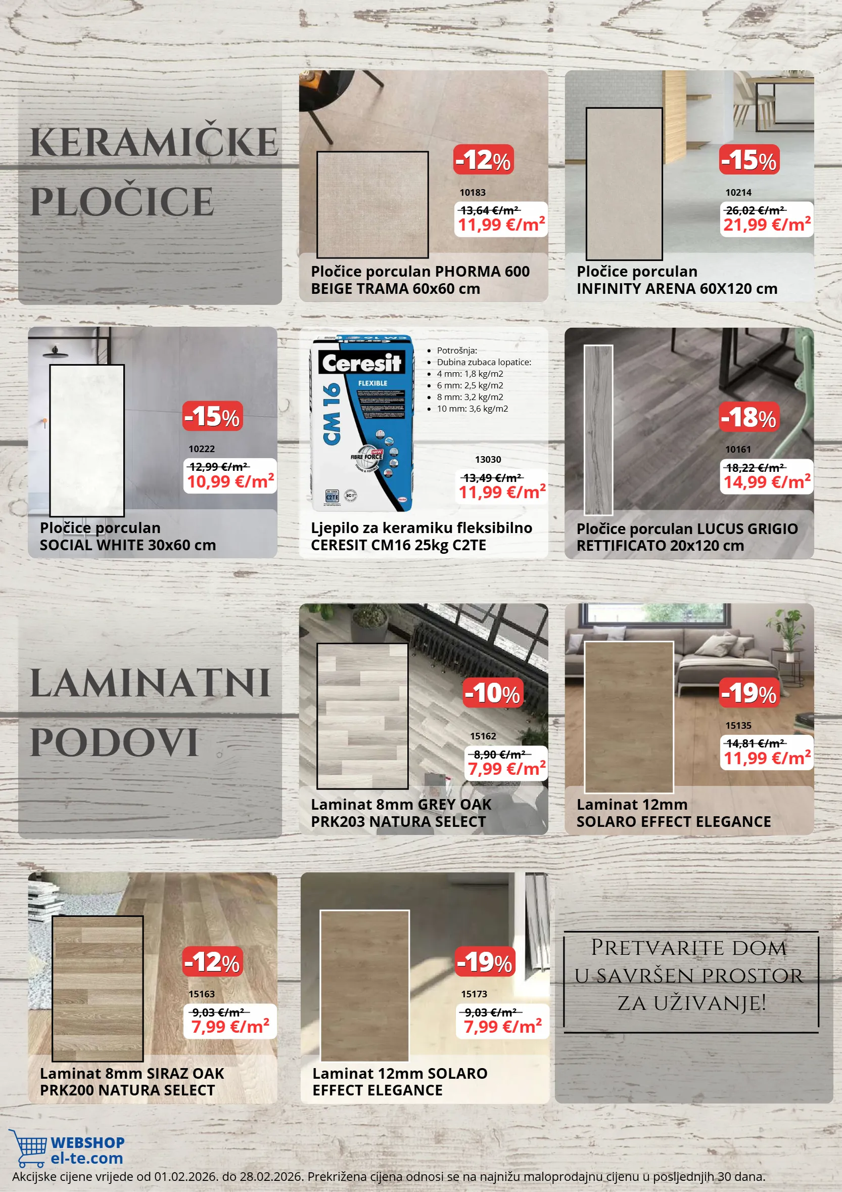 webshop el-te.com 18,22 €/m² 12,99 €/m² 9,03 €/m² 13,64 €/m² 13,49 €/m² 8,90 €/m² 26,02 €/m² 14,81 €/m² 9,03 €/m² -18 -18 % % -15 -15 % % -12 -12 % % -12 -12 % % -15 -15 % % -19 -19 % % -10 -10 % % -19 -19 % % pretvarite dom u savršen prostor za uživanje! akcijske cijene vrijede od 01.02.2026. do 28.02.2026. prekrižena cijena odnosi se na najnižu maloprodajnu cijenu u posljednjih 30 dana. pločice porculan lucus grigio rettificato 20x120 cm pločice porculan social white 30x60 cm laminat 8mm siraz oak prk200 natura select pločice porculan phorma 600 beige trama 60x60 cm ljepilo za keramiku fleksibilno ceresit cm16 25kg c2te laminat 8mm grey oak prk203 natura select pločice porculan infinity arena 60x120 cm laminat 12mm solaro effect elegance laminat 12mm solaro effect elegance 10161 10222 15163 10183 13030 15162 10214 15135 15173 14,99 €/m² 10,99 €/m² 7,99 €/m² 11,99 €/m² 11,99 €/m² 7,99 €/m² 21,99 €/m² 11,99 €/m² 7,99 €/m² potrošnja: dubina zubaca lopatice: 4 mm: 1,8 kg/m2 6 mm: 2,5 kg/m2 8 mm: 3,2 kg/m2 10 mm: 3,6 kg/m2 keramičke pločice laminatni podovi