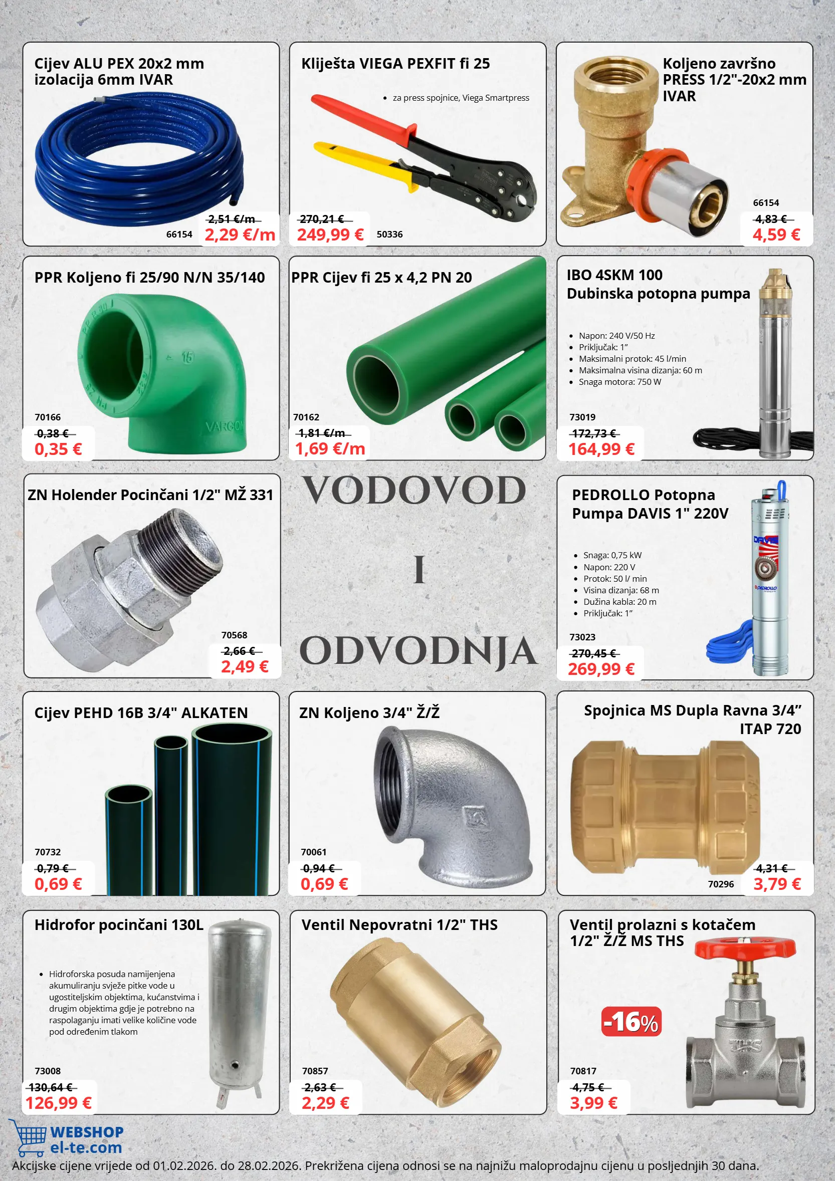 4,93 €/kom webshop el-te.com cijev alu pex 20x2 mm izolacija 6mm ivar 2,51 €/m 1,81 €/m 4,83 € 0,38 € 2,66 € 0,79 € 130,64 € 2,63 € 4,75 € 0,94 € 4,31 € 172,73 € 270,45 € 66154 2,29 €/m 1,69 €/m 70568 2,49 € zn holender pocinčani 1/2" mž 331 -16 -16 % % koljeno završno press 1/2"-20x2 mm ivar 66154 70166 70732 73008 70857 70817 70061 70296 73019 73023 70162 4,59 € 0,35 € 0,69 € 126,99 € 2,29 € 3,99 € 0,69 € 3,79 € 164,99 € 269,99 € kliješta viega pexfit fi 25 ppr koljeno fi 25/90 n/n 35/140 cijev pehd 16b 3/4" alkaten hidrofor pocinčani 130l ventil nepovratni 1/2" ths ventil prolazni s kotačem 1/2" ž/ž ms ths ppr cijev fi 25 x 4,2 pn 20 zn koljeno 3/4" ž/ž ibo 4skm 100 dubinska potopna pumpa pedrollo potopna pumpa davis 1" 220v spojnica ms dupla ravna 3/4” itap 720 napon: 240 v/50 hz priključak: 1” maksimalni protok: 45 l/min maksimalna visina dizanja: 60 m snaga motora: 750 w snaga: 0,75 kw napon: 220 v protok: 50 l/ min visina dizanja: 68 m dužina kabla: 20 m priključak: 1” vodovod odvodnja akcijske cijene vrijede od 01.02.2026. do 28.02.2026. prekrižena cijena odnosi se na najnižu maloprodajnu cijenu u posljednjih 30 dana. za press spojnice, viega smartpress 270,21 € 50336 249,99 € i hidroforska posuda namijenjena akumuliranju svježe pitke vode u ugostiteljskim objektima, kućanstvima i drugim objektima gdje je potrebno na raspolaganju imati velike količine vode pod određenim tlakom