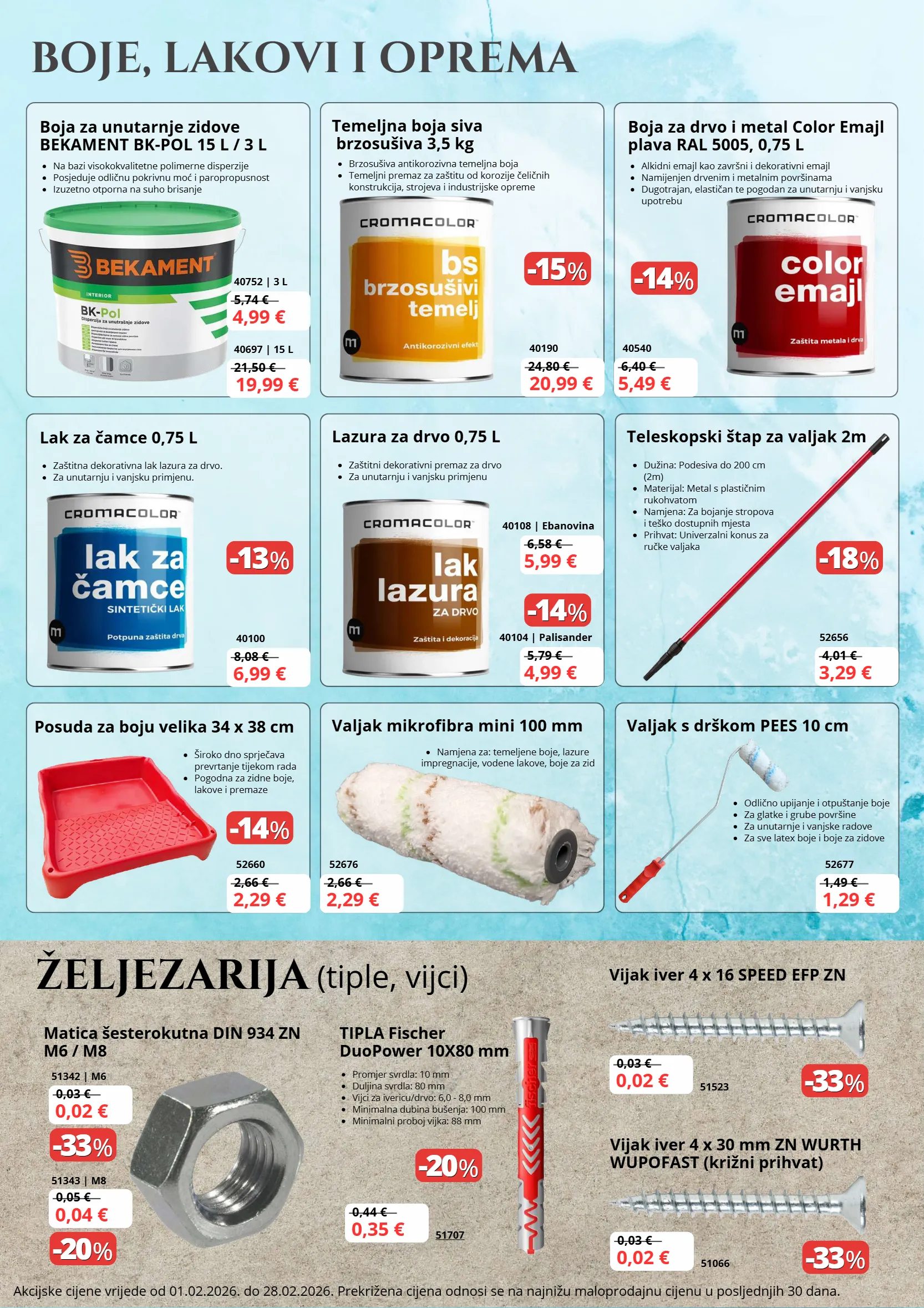 21,50 € 8,08 € 2,66 € 2,66 € 1,49 € 5,74 € 24,80 € 5,79 € 4,01 € 6,58 € 6,40 € -15 -15 % % -14 -14 % % -13 -13 % % -14 -14 % % -18 -18 % % -14 -14 % % 0,03 € 0,03 € 0,44 € 0,05 € 0,03 € -33 -33 % % -33 -33 % % -20 -20 % % -33 -33 % % -20 -20 % % Vijak iver 4 x 30 mm ZN WURTH WUPOFAST (križni prihvat) Vijak iver 4 x 16 SPEED EFP ZN TIPLA Fischer DuoPower 10X80 mm Matica šesterokutna DIN 934 ZN M6 / M8 51066 51523 51707 51343 | M8 51342 | M6 0,02 € 0,02 € 0,35 € 0,04 € 0,02 € Boja za unutarnje zidove BEKAMENT BK-POL 15 L / 3 L Lak za čamce 0,75 L Posuda za boju velika 34 x 38 cm Boja za drvo i metal Color Emajl plava RAL 5005, 0,75 L Na bazi visokokvalitetne polimerne disperzije Posjeduje odličnu pokrivnu moć i paropropusnost Izuzetno otporna na suho brisanje Zaštitna dekorativna lak lazura za drvo. Za unutarnju i vanjsku primjenu. Široko dno sprječava prevrtanje tijekom rada Pogodna za zidne boje, lakove i premaze Promjer svrdla: 10 mm Duljina svrdla: 80 mm Vijci za ivericu/drvo: 6,0 - 8,0 mm Minimalna dubina bušenja: 100 mm Minimalni proboj vijka: 88 mm Alkidni emajl kao završni i dekorativni emajl Namijenjen drvenim i metalnim površinama Dugotrajan, elastičan te pogodan za unutarnju i vanjsku upotrebu BOJE, LAKOVI I OPREMA Akcijske cijene vrijede od 01.02.2026. do 28.02.2026. Prekrižena cijena odnosi se na najnižu maloprodajnu cijenu u posljednjih 30 dana. 40697 | 15 L 40100 52660 52676 52677 40752 | 3 L 40190 40104 | Palisander 52656 40108 | Ebanovina 40540 19,99 € 6,99 € 2,29 € 2,29 € 1,29 € 4,99 € 20,99 € 4,99 € 3,29 € 5,99 € 5,49 € Temeljna boja siva brzosušiva 3,5 kg Lazura za drvo 0,75 L Valjak mikrofibra mini 100 mm Teleskopski štap za valjak 2m Valjak s drškom PEES 10 cm Brzosušiva antikorozivna temeljna boja Temeljni premaz za zaštitu od korozije čeličnih konstrukcija, strojeva i industrijske opreme Zaštitni dekorativni premaz za drvo Za unutarnju i vanjsku primjenu Namjena za: temeljene boje, lazure impregnacije, vodene lakove, boje za zid Dužina: Podesiva do 200 cm (2m) Materijal: Metal s plastičnim rukohvatom Namjena: Za bojanje stropova i teško dostupnih mjesta Prihvat: Univerzalni konus za ručke valjaka Odlično upijanje i otpuštanje boje Za glatke i grube površine Za unutarnje i vanjske radove Za sve latex boje i boje za zidove ŽELJEZARIJA (tiple, vijci)