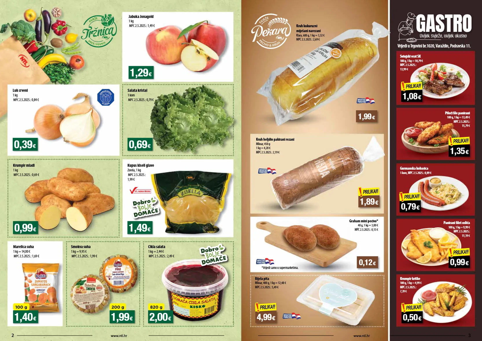 *vrijedi samo u supermarketima. vrijedi u trgovini br.1020, varaždin, podravska 11. 1,89 € 4,99 € 1,99 € 0,12 € kruh heljdin pakirani rezani mlinar, 450 g 1 kg = 4,20 € mpc 2.5.2025.: 2,19 € bijela pita mlinar, 400 g, 1 kg = 12,48 € mpc 2.5.2025.: 5,49 € kruh kukuruzni miješani narezani klara, 600 g, 1 kg = 3,32 € mpc 2.5.2025.: 2,69 € graham mini pecivo* 40 g, 1 kg = 3,00 € mpc 2.5.2025.: 0,15 € gastro 1,08 € 0,99 € 1,35 € 0,79 € 0,50 € svinjski vrat sk 100 g, 1 kg = 10,79 € mpc 2.5.2025.: 13,99 € panirani filet oslića 100 g, 1 kg = 9,99 € mpc 2.5.2025.: 11,19 € pileći file panirani 100 g, 1 kg = 13,49 € mpc 2.5.2025.: 15,79 € gurmanska kobasica 1 kom, mpc 2.5.2025.: 0,89 € krumpir kriške 100 g, 1 kg = 4,99 € mpc 2.5.2025.: 7,39 € jabuka jonagold 1 kg mpc 2.5.2025.: 1,49 € salata kristal 1 kom mpc 2.5.2025.: 0,79 € luk crveni 1 kg mpc 2.5.2025.: 0,84 € krumpir mladi 1 kg mpc 2.5.2025.: 0,69 € kupus kiseli glave zorela, 1 kg mpc 2.5.2025.: 1,99 € 1,29 € 0,69 € 0,39 € 0,99 € 1,49 € marelica suha 1 kg = 14,00 € mpc 2.5.2025.: 1,69 € cikla salata 1 kg = 2,44 € mpc 2.5.2025.: 2,49 € smokva suha 1 kg = 9,95 € mpc 2.5.2025.: 1,99 € 1,40 € 100 g 2,00 € 820 g 1,99 € 200 g 2 www.ntl.hr 3 www.ntl.hr