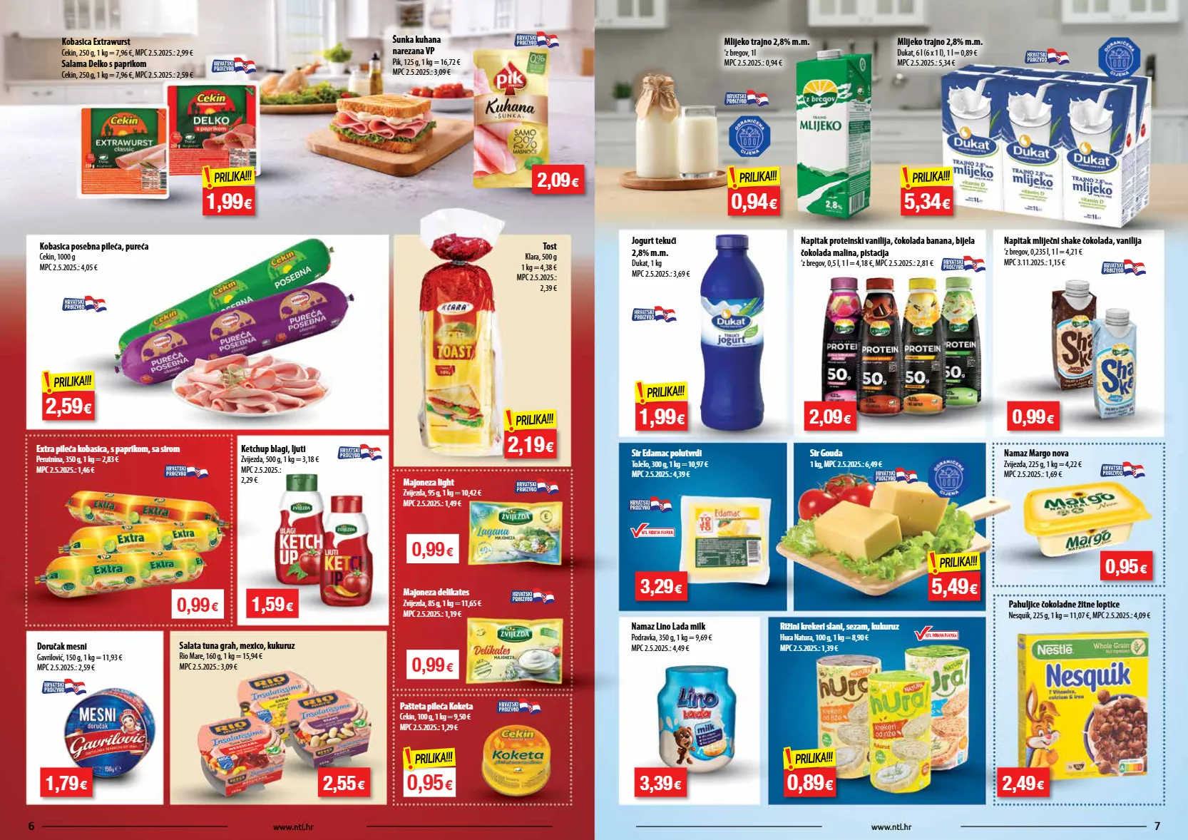 2,55 € 0,99 € 2,09 € 0,95 € 1,79 € 1,59 € 5,49 € 2,19 € 0,99 € 0,99 € 0,95 € 3,29 € salata tuna grah, mexico, kukuruz rio mare, 160 g, 1 kg = 15,94 € mpc 2.5.2025.: 3,09 € extra pileća kobasica, s paprikom, sa sirom perutnina, 350 g, 1 kg = 2,83 € mpc 2.5.2025.: 1,46 € šunka kuhana narezana vp pik, 125 g, 1 kg = 16,72 € mpc 2.5.2025.: 3,09 € pašteta pileća koketa cekin, 100 g, 1 kg = 9,50 € mpc 2.5.2025.: 1,29 € doručak mesni gavrilović, 150 g, 1 kg = 11,93 € mpc 2.5.2025.: 2,59 € ketchup blagi, ljuti zvijezda, 500 g, 1 kg = 3,18 € mpc 2.5.2025.: 2,29 € sir gouda 1 kg, mpc 2.5.2025.: 6,49 € tost klara, 500 g 1 kg = 4,38 € mpc 2.5.2025.: 2,39 € majoneza delikates zvijezda, 85 g, 1 kg = 11,65 € mpc 2.5.2025.: 1,19 € majoneza light zvijezda, 95 g, 1 kg = 10,42 € mpc 2.5.2025.: 1,49 € namaz margo nova zvijezda, 225 g, 1 kg = 4,22 € mpc 2.5.2025.: 1,69 € sir edamac polutvrdi tojeto, 300 g, 1 kg = 10,97 € mpc 2.5.2025.: 4,39 € 5,34 € 1,99 € 2,09 € 0,94 € 0,99 € 3,39 € 2,49 € 0,89 € mlijeko trajno 2,8% m.m. dukat, 6 l (6 x 1 l), 1 l = 0,89 € mpc 2.5.2025.: 5,34 € jogurt tekući 2,8% m.m. dukat, 1 kg mpc 2.5.2025.: 3,69 € napitak proteinski vanilija, čokolada banana, bijela čokolada malina, pistacija ‘z bregov, 0,5 l, 1 l = 4,18 €, mpc 2.5.2025.: 2,81 € mlijeko trajno 2,8% m.m. ‘z bregov, 1l mpc 2.5.2025.: 0,94 € napitak mliječni shake čokolada, vanilija ‘z bregov, 0,235 l, 1 l = 4,21 € mpc 3.11.2025.: 1,15 € namaz lino lada milk podravka, 350 g, 1 kg = 9,69 € mpc 2.5.2025.: 4,49 € pahuljice čokoladne žitne loptice nesquik, 225 g, 1 kg = 11,07 €, mpc 2.5.2025.: 4,09 € rižini krekeri slani, sezam, kukuruz hura natura, 100 g, 1 kg = 8,90 € mpc 2.5.2025.: 1,39 € 1,99 € kobasica extrawurst cekin, 250 g, 1 kg = 7,96 €, mpc 2.5.2025.: 2,99 € salama delko s paprikom cekin, 250 g, 1 kg = 7,96 €, mpc 2.5.2025.: 2,59 € 2,59 € kobasica posebna pileća, pureća cekin, 1000 g mpc 2.5.2025.: 4,05 € 6 www.ntl.hr 7 www.ntl.hr