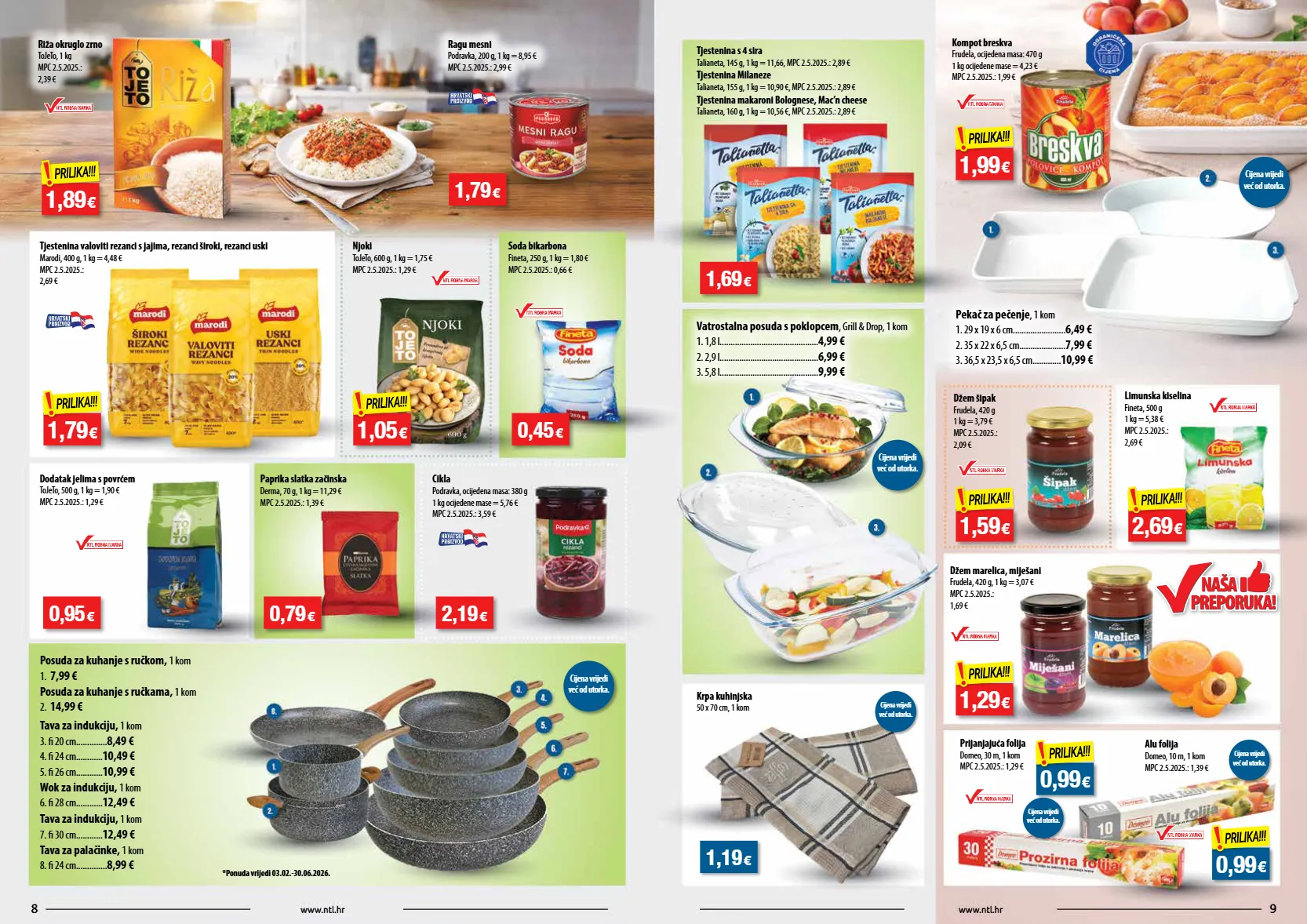 1,89 € 1,79 € 1,69 € 0,95 € 0,45 € 1,05 € 2,69 € 0,79 € 2,19 € 1,29 € 1,59 € 1,99 € riža okruglo zrno tojeto, 1 kg mpc 2.5.2025.: 2,39 € tjestenina valoviti rezanci s jajima, rezanci široki, rezanci uski marodi, 400 g, 1 kg = 4,48 € mpc 2.5.2025.: 2,69 € tjestenina s 4 sira talianeta, 145 g, 1 kg = 11,66, mpc 2.5.2025.: 2,89 € tjestenina milaneze talianeta, 155 g, 1 kg = 10,90 €, mpc 2.5.2025.: 2,89 € tjestenina makaroni bolognese, mac’n cheese talianeta, 160 g, 1 kg = 10,56 €, mpc 2.5.2025.: 2,89 € dodatak jelima s povrćem tojeto, 500 g, 1 kg = 1,90 € mpc 2.5.2025.: 1,29 € soda bikarbona fineta, 250 g, 1 kg = 1,80 € mpc 2.5.2025.: 0,66 € njoki tojeto, 600 g, 1 kg = 1,75 € mpc 2.5.2025.: 1,29 € limunska kiselina fineta, 500 g 1 kg = 5,38 € mpc 2.5.2025.: 2,69 € paprika slatka začinska derma, 70 g, 1 kg = 11,29 € mpc 2.5.2025.: 1,39 € cikla podravka, ocijeđena masa: 380 g 1 kg ocijeđene mase = 5,76 € mpc 2.5.2025.: 3,59 € džem marelica, miješani frudela, 420 g, 1 kg = 3,07 € mpc 2.5.2025.: 1,69 € džem šipak frudela, 420 g 1 kg = 3,79 € mpc 2.5.2025.: 2,09 € kompot breskva frudela, ocijeđena masa: 470 g 1 kg ocijeđene mase = 4,23 € mpc 2.5.2025.: 1,99 € 1,79 € ragu mesni podravka, 200 g, 1 kg = 8,95 € mpc 2.5.2025.: 2,99 € posuda za kuhanje s ručkom, 1 kom 1. 7,99 € posuda za kuhanje s ručkama, 1 kom 2. 14,99 € tava za indukciju, 1 kom 3. fi 20 cm.............. 8,49 € 4. fi 24 cm............ 10,49 € 5. fi 26 cm............ 10,99 € wok za indukciju, 1 kom 6. fi 28 cm............ 12,49 € tava za indukciju, 1 kom 7. fi 30 cm............ 12,49 € tava za palačinke, 1 kom 8. fi 24 cm.............. 8,99 € *ponuda vrijedi 03.02.-30.06.2026. 1,19 € 0,99 € 0,99 € vatrostalna posuda s poklopcem , grill & drop, 1 kom 1. 1,8 l............................................. 4,99 € 2. 2,9 l............................................. 6,99 € 3. 5,8 l............................................. 9,99 € pekač za pečenje , 1 kom 1. 29 x 19 x 6 cm........................ 6,49 € 2. 35 x 22 x 6,5 cm..................... 7,99 € 3. 36,5 x 23,5 x 6,5 cm............. 10,99 € krpa kuhinjska 50 x 70 cm, 1 kom alu folija domeo, 10 m, 1 kom mpc 2.5.2025.: 1,39 € prijanjajuća folija domeo, 30 m, 1 kom mpc 2.5.2025.: 1,29 € cijena vrijedi već od utorka. cijena vrijedi već od utorka. cijena vrijedi već od utorka. cijena vrijedi već od utorka. cijena vrijedi već od utorka. cijena vrijedi već od utorka. 8 www.ntl.hr 9 www.ntl.hr