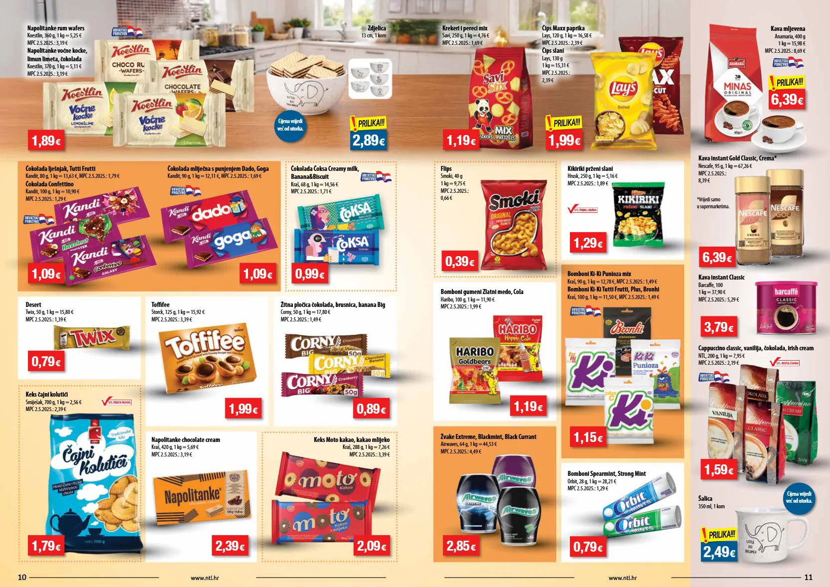 1,09 € 1,09 € 1,89 € 0,79 € 0,89 € 0,79 € 2,85 € 0,99 € 1,15 € 2,09 € 2,39 € 1,19 € 1,99 € 1,79 € čokolada lješnjak, tutti frutti kandit, 80 g, 1 kg = 13,63 €, mpc 2.5.2025.: 1,79 € čokolada confettino kandit, 100 g, 1 kg = 10,90 € mpc 2.5.2025.: 1,29 € čokolada mliječna s punjenjem dado, goga kandit, 90 g, 1 kg = 12,11 €, mpc 2.5.2025.: 1,69 € napolitanke rum wafers koestlin, 360 g, 1 kg = 5,25 € mpc 2.5.2025.: 3,19 € napolitanke voćne kocke, limun limeta, čokolada koestlin, 370 g, 1 kg = 5,11 € mpc 2.5.2025.: 3,19 € desert twix, 50 g, 1 kg = 15,80 € mpc 2.5.2025.: 1,39 € žitna pločica čokolada, brusnica, banana big corny, 50 g, 1 kg = 17,80 € mpc 2.5.2025.: 1,49 € bomboni spearmint, strong mint orbit, 28 g, 1 kg = 28,21 € mpc 2.5.2025.: 1,29 € žvake extreme, blackmint, black currant airwaves, 64 g, 1 kg = 44,53 € mpc 2.5.2025.: 4,49 € čokolada čoksa creamy milk, banana&biscuit kraš, 68 g, 1 kg = 14,56 € mpc 2.5.2025.: 1,71 € bomboni ki-ki punioza mix kraš, 90 g, 1 kg = 12,78 €, mpc 2.5.2025.: 1,49 € bomboni ki-ki tutti frutti, plus, bronhi kraš, 100 g, 1 kg = 11,50 €, mpc 2.5.2025.: 1,49 € keks moto kakao, kakao mlijeko kraš, 288 g, 1 kg = 7,26 € mpc 2.5.2025.: 3,39 € napolitanke chocolate cream kraš, 420 g, 1 kg = 5,69 € mpc 2.5.2025.: 3,19 € bomboni gumeni zlatni medo, cola haribo, 100 g, 1 kg = 11,90 € mpc 2.5.2025.: 1,99 € toffifee storck, 125 g, 1 kg = 15,92 € mpc 2.5.2025.: 3,39 € keks čajni kolutići smiješak, 700 g, 1 kg = 2,56 € mpc 2.5.2025.: 2,39 € 1,19 € 0,39 € 1,29 € krekeri i pereci mix savi, 250 g, 1 kg = 4,76 € mpc 2.5.2025.: 1,69 € flips smoki, 40 g 1 kg = 9,75 € mpc 2.5.2025.: 0,66 € čips maxx paprika lays, 120 g, 1 kg = 16,58 € mpc 2.5.2025.: 2,39 € čips slani lays, 130 g 1 kg = 15,31 € mpc 2.5.2025.: 2,39 € kikiriki prženi slani hrusk, 250 g, 1 kg = 5,16 € mpc 2.5.2025.: 1,89 € 6,39 € 3,79 € 6,39 € 1,99 € 1,59 € kava instant gold classic, crema* nescafe, 95 g, 1 kg = 67,26 € mpc 2.5.2025.: 8,39 € kava instant classic barcaffe, 100 1 kg = 37,90 € mpc 2.5.2025.: 5,29 € kava mljevena anamaria, 400 g 1 kg = 15,98 € mpc 2.5.2025.: 8,69 € cappuccino classic, vanilija, čokolada, irish cream ntl, 200 g, 1 kg = 7,95 € mpc 2.5.2025.: 2,19 € *vrijedi samo u supermarketima. 2,49 € 2,89 € šalica 350 ml, 1 kom zdjelica 13 cm, 1 kom cijena vrijedi već od utorka. cijena vrijedi već od utorka. 10 www.ntl.hr 11 www.ntl.hr