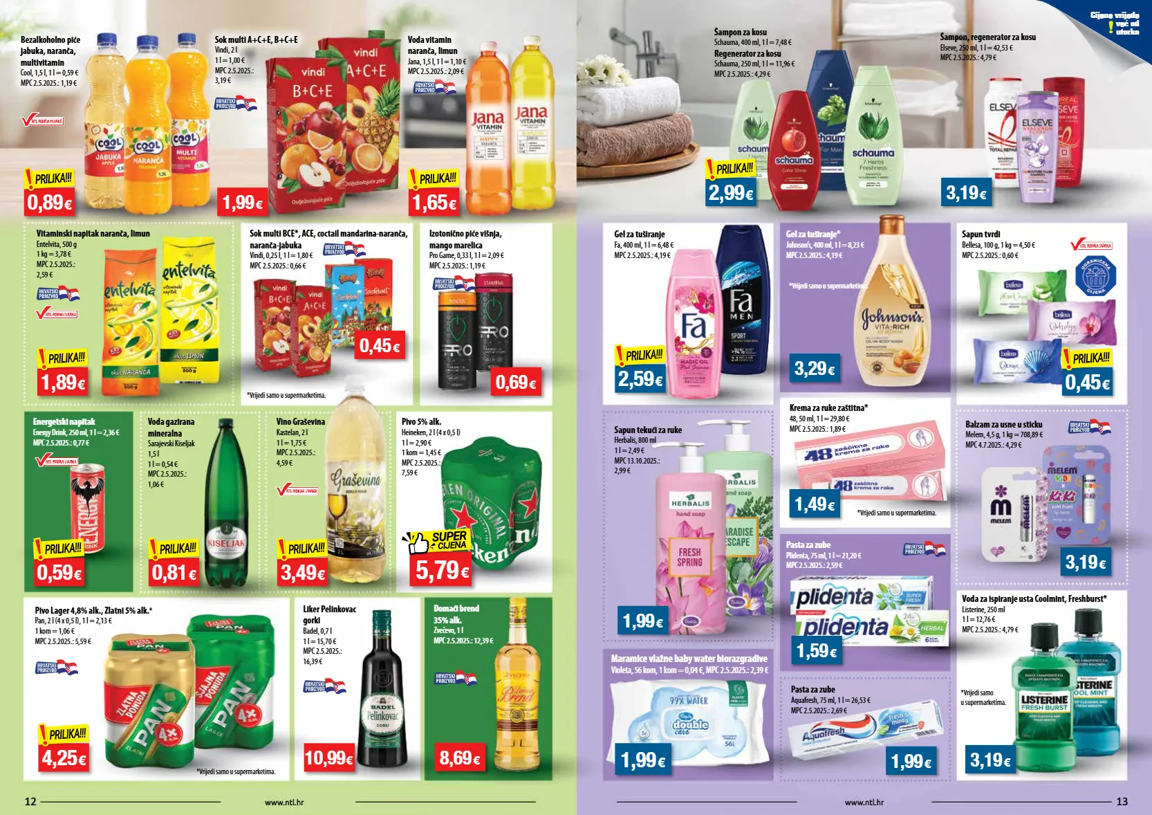 0,45 € 1,99 € 0,81 € 1,65 € 0,89 € 1,89 € 0,59 € 0,69 € 5,79 € 4,25 € 3,49 € 8,69 € *vrijedi samo u supermarketima. sok multi bce*, ace, coctail mandarina-naranča, naranča-jabuka vindi, 0,25 l, 1 l = 1,80 € mpc 2.5.2025.: 0,66 € sok multi a+c+e, b+c+e vindi, 2 l 1 l = 1,00 € mpc 2.5.2025.: 3,19 € voda gazirana mineralna sarajevski kiseljak 1,5 l 1 l = 0,54 € mpc 2.5.2025.: 1,06 € voda vitamin naranča, limun jana, 1,5 l, 1 l = 1,10 € mpc 2.5.2025.: 2,09 € bezalkoholno piće jabuka, naranča, multivitamin cool, 1,5 l, 1 l = 0,59 € mpc 2.5.2025.: 1,19 € 10,99 € vitaminski napitak naranča, limun entelvita, 500 g 1 kg = 3,78 € mpc 2.5.2025.: 2,59 € energetski napitak energy drink, 250 ml, 1 l = 2,36 € mpc 2.5.2025.: 0,77 € izotonično piće višnja, mango marelica pro game, 0,33 l, 1 l = 2,09 € mpc 2.5.2025.: 1,19 € pivo 5% alk. heineken, 2 l (4 x 0,5 l) 1 l = 2,90 € 1 kom = 1,45 € mpc 2.5.2025.: 7,59 € pivo lager 4,8% alk., zlatni 5% alk. * pan, 2 l (4 x 0,5 l), 1 l = 2,13 € 1 kom = 1,06 € mpc 2.5.2025.: 5,59 € vino graševina kastelan, 2 l 1 l = 1,75 € mpc 2.5.2025.: 4,59 € liker pelinkovac gorki badel, 0,7 l 1 l = 15,70 € mpc 2.5.2025.: 16,39 € domaći brend 35% alk. zvečevo, 1 l mpc 2.5.2025.: 12,39 € *vrijedi samo u supermarketima. 1,99 € 2,59 € 2,99 € 1,99 € 3,19 € 1,59 € 3,19 € 1,49 € 3,19 € 3,29 € 0,45 € sapun tekući za ruke herbalis, 800 ml 1 l = 2,49 € mpc 13.10.2025.: 2,99 € gel za tuširanje fa, 400 ml, 1 l = 6,48 € mpc 2.5.2025.: 4,19 € šampon za kosu schauma, 400 ml, 1 l = 7,48 € regenerator za kosu schauma, 250 ml, 1 l = 11,96 € mpc 2.5.2025.: 4,29 € pasta za zube aquafresh, 75 ml, 1 l = 26,53 € mpc 2.5.2025.: 2,69 € šampon, regenerator za kosu elseve, 250 ml, 1 l = 42,53 € mpc 2.5.2025.: 4,79 € pasta za zube plidenta, 75 ml, 1 l = 21,20 € mpc 2.5.2025.: 2,59 € balzam za usne u sticku melem, 4,5 g, 1 kg = 708,89 € mpc 4.7.2025.: 4,29 € krema za ruke zaštitna* 48, 50 ml, 1 l = 29,80 € mpc 2.5.2025.: 1,89 € voda za ispiranje usta coolmint, freshburst* listerine, 250 ml 1 l = 12,76 € mpc 2.5.2025.: 4,79 € *vrijedi samo u supermarketima. *vrijedi samo u supermarketima. *vrijedi samo u supermarketima. gel za tuširanje* johnson’s, 400 ml, 1 l = 8,23 € mpc 2.5.2025.: 4,19 € sapun tvrdi bellesa, 100 g, 1 kg = 4,50 € mpc 2.5.2025.: 0,60 € 1,99 € maramice vlažne baby water biorazgradive violeta, 56 kom, 1 kom = 0,04 €, mpc 2.5.2025.: 2,39 € cijene vrijede već od utorka ! 12 www.ntl.hr 13 www.ntl.hr