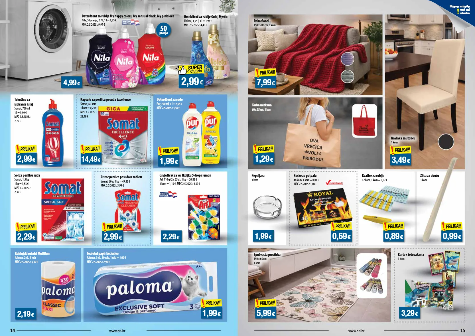 2,19 € 1,99 € kuhinjski ručnici multifun paloma, 2-sl., 1 rola mpc 2.5.2025.: 3,39 € toaletni papir exclusive paloma, 3-sl., 10 rola, 1 rola = 1,00 € mpc 2.5.2025.: 2,99 € 0,99 € 0,69 € 3,29 € 4,99 € 2,29 € 2,99 € 1,99 € 2,29 € 2,99 € 2,99 € 14,49 € 1,29 € 3,49 € 7,99 € 0,89 € 5,99 € 1,99 € žlica za obuću 1 kom kocke za potpalu 48 kom, 1 kom = 0,01 € mpc 2.5.2025.: 1,09 € karte s tetovažama 1 kom deterdžent za rublje my happy colors, my sensual black, my pink love nila, 50 pranja, 2,7 l, 1 l = 1,85 € mpc 2.5.2025.: 9,99 € osvježivač za wc školjku 5 drops lemon arf, 110 g (2 x 55 g), 1 kg = 20,82 € 1 kom = 1,15 €, mpc 2.5.2025.: 4,39 € omekšivač za rublje gold, mystic violeta, 1,55 l, 1 l = 1,93 € mpc 2.5.2025.: 4,49 € deterdžent za suđe pur, 750 ml, 1 l = 2,65 € mpc 2.5.2025.: 3,59 € sol za perilicu suđa somat, 1,5 kg 1 kg = 1,53 € mpc 2.5.2025.: 2,39 € tekućina za ispiranje i sjaj somat, 750 ml 1 l = 3,99 € mpc 2.5.2025.: 7,79 € čistač perilice posuđa u tableti somat, 60 g, 1 kg = 49,83 € mpc 2.5.2025.: 3,99 € kapsule za perilicu posuđa excellence somat, 60 kom 1 kom = 0,24 € mpc 2.5.2025.: 22,49 € torba netkana 60 x 55 cm, 1 kom navlaka za stolicu 1 kom deka flanel 150 x 200 cm, 1 kom kvačice za rublje 12 kom, 1 kom = 0,07 € spužvasta prostirka 150 x 65 cm 1 kom pepeljara 1 kom cijene vrijede već od utorka ! 50 pranja 14 www.ntl.hr 15 www.ntl.hr