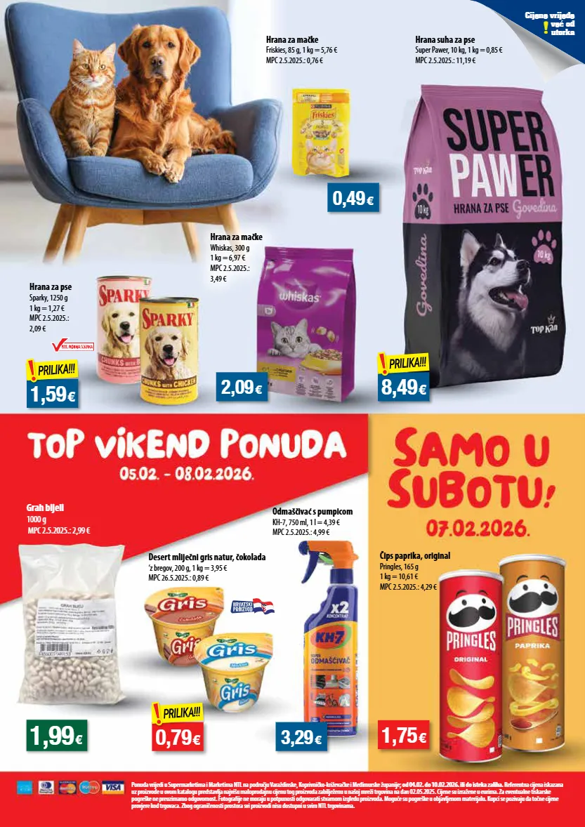 ponuda vrijedi u supermarketima i marketima ntl na području varaždinske, koprivničko-križevačke i međimurske županije; od 04.02. do 10.02.2026. ili do isteka zaliha. referentna cijena iskazana uz proizvode u ovom katalogu predstavlja najvišu maloprodajnu cijenu tog proizvoda zabilježenu u našoj mreži trgovina na dan 02.05.2025. cijene su izražene u eurima. za eventualne tiskarske pogreške ne preuzimamo odgovornost. fotografije ne moraju u potpunosti odgovarati stvarnom izgledu proizvoda. moguće su pogreške u objavljenom materijalu. kupci se pozivaju da točne cijene provjere kod trgovaca. zbog ograničenosti prostora svi proizvodi nisu dostupni u svim ntl trgovinama. 1,75 € 1,59 € 2,09 € 0,49 € 8,49 € hrana za pse sparky, 1250 g 1 kg = 1,27 € mpc 2.5.2025.: 2,09 € hrana za mačke whiskas, 300 g 1 kg = 6,97 € mpc 2.5.2025.: 3,49 € čips paprika, original pringles, 165 g 1 kg = 10,61 € mpc 2.5.2025.: 4,29 € hrana za mačke friskies, 85 g, 1 kg = 5,76 € mpc 2.5.2025.: 0,76 € hrana suha za pse super pawer, 10 kg, 1 kg = 0,85 € mpc 2.5.2025.: 11,19 € cijene vrijede već od utorka ! 0,79 € 3,29 € desert mliječni gris natur, čokolada ‘z bregov, 200 g, 1 kg = 3,95 € mpc 26.5.2025.: 0,89 € odmaščivać s pumpicom kh-7, 750 ml, 1 l = 4,39 € mpc 2.5.2025.: 4,99 € grah bijeli 1000 g mpc 2.5.2025.: 2,99 € 1,99 €