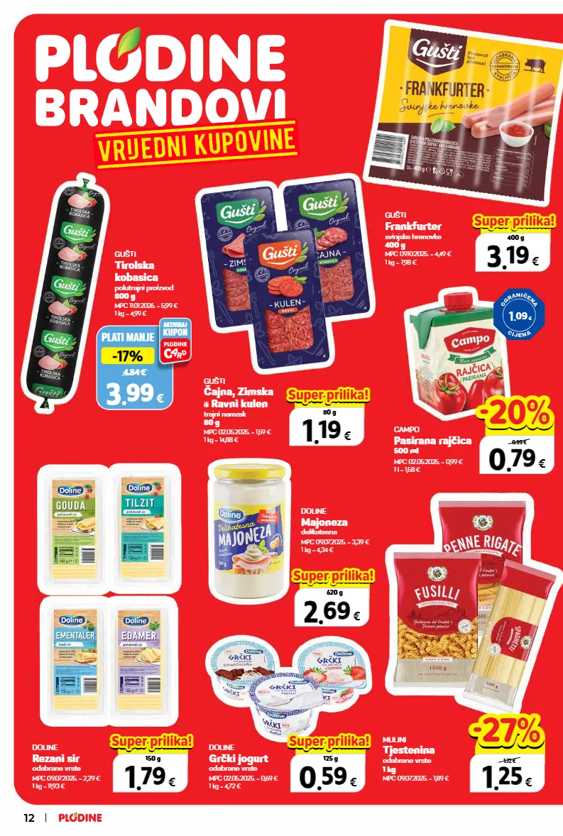 top cijena! već od hit cijena! 1 1 . . 19 19 € 80 g super prilika! super prilika! gušti čajna, zimska ili ravni kulen trajni narezak 80 g mpc 02.05.2025. = 1,59 € 1 kg = 14,88 € gušti frankfurter svinjske hrenovke 400 g mpc 09.10.2025. = 4,49 € 1 kg = 7,98 € top cijena! već od hit cijena! 3 3 . . 19 19 € 400 g super prilika! super prilika! 1 . 09 € 0 0 . . 79 79 € xxxxx 0.99 € -20% -20% doline rezani sir odabrane vrste mpc 09.07.2025. = 2,29 € 1 kg = 11,93 € campo pasirana rajčica 500 ml mpc 02.05.2025. = 0,99 € 1 l = 1,58 € top cijena! već od hit cijena! 1 1 . . 79 79 € 150 g super prilika! super prilika! doline majoneza delikatesna mpc 09.07.2025. = 3,39 € 1 kg = 4,34 € top cijena! već od hit cijena! 2 2 . . 69 69 € 620 g super prilika! super prilika! doline grčki jogurt odabrane vrste mpc 02.05.2025. = 0,69 € 1 kg = 4,72 € top cijena! već od hit cijena! 0 0 . . 59 59 € 125 g super prilika! super prilika! gušti tirolska kobasica polutrajni proizvod 800 g mpc 11.01.2026. = 5,99 € 1 kg = 4,99 € plati manje 4.84 € -17% -17% 3 3 . . 99 99 € aktiviraj kupon mulini tjestenina odabrane vrste 1 kg mpc 09.07.2025. = 1,89 € top cijena! već od hit cijena! super prilika! 1 1 . . 25 25 € 1 kg samo u plodinama 1.72 € -27% -27% 12