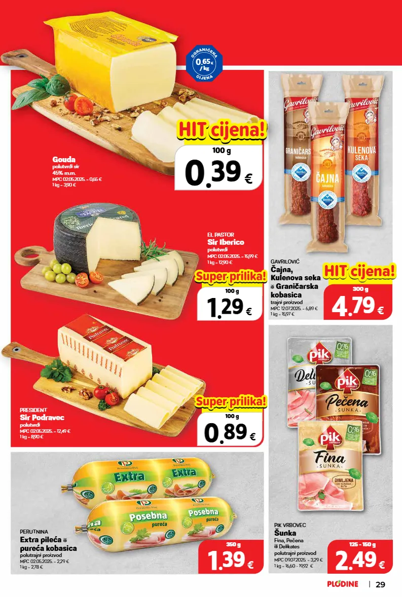 president sir podravec polutvrdi mpc 02.05.2025. = 12,49 € 1 kg = 8,90 € el pastor sir iberico polutvrdi mpc 02.05.2025. = 15,99 € 1 kg = 12,90 € top cijena! već od hit cijena! 1 1 . . 29 29 € 100 g super prilika! super prilika! top cijena! već od hit cijena! 0 0 . . 89 89 € 100 g super prilika! super prilika! gavrilović čajna, kulenova seka ili graničarska kobasica trajni proizvod mpc 12.07.2025. = 6,89 € 1 kg = 15,97 € top cijena! već od hit cijena! 4 4 . . 79 79 € 300 g hit hit cijena! cijena! gouda polutvrdi sir 45% m.m. mpc 02.05.2025. = 0,65 € 1 kg = 3,90 € hit hit cijena! cijena! 0 0 . . 39 39 € 100 g 0 . 65 € / kg pik vrbovec šunka fina, pečena ili delikates polutrajni proizvod mpc 09.07.2025. = 3,29 € 1 kg = 16,60 - 19,92 € 2 2 . . 49 49 € 125 - 150 g perutnina extra pileća ili pureća kobasica polutrajni proizvod mpc 02.05.2025. = 2,29 € 1 kg = 2,78 € 1 1 . . 39 39 € 350 g 29