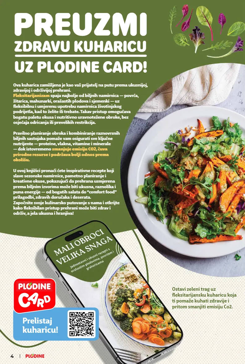Prelistaj kuharicu! Ostavi zeleni trag uz fleksitarijansku kuharicu koja ti pomaže kuhati zdravije i pritom smanjiti emisiju Co2. Ova kuharica zamišljena je kao vaš prijatelj na putu prema ukusnijoj, zdravijoj i održivijoj prehrani. Fleksitarijanizam spaja najbolje od biljnih namirnica — povrća, žitarica, mahunarki, orašastih plodova i sjemenki — uz fleksibilnu i umjerenu upotrebu namirnica životinjskog podrijetla, kad to želite ili trebate. Takav pristup omogućava bogatu paletu okusa i nutritivno uravnotežene obroke, bez osjećaja odricanja ili prevelikih restrikcija. Pravilno planiranje obroka i kombiniranje raznovrsnih biljnih sastojaka pomaže vam osigurati sve ključne nutrijente — proteine, vlakna, vitamine i minerale — dok istovremeno smanjuje emisiju CO2, čuva prirodne resurse i podržava bolji odnos prema okolišu. U ovoj knjižici pronaći ćete inspirativne recepte koji slave sezonske namirnice, pametno planiranje i kreativne okuse, pokazujući da prehrana usmjerena prema biljnim izvorima može biti ukusna, raznolika i puna energije — od bogatih salata do “comfort food” prilagodbi, zdravih doručaka i deserata. Započnite svoje kulinarsko putovanje s nama i otkrijte kako fleksibilan pristup prehrani može biti zdrav i održiv, a jela ukusna i hranjiva! ZDRAVU KUHARICU UZ PLODINE CARD! PREUZMI 4