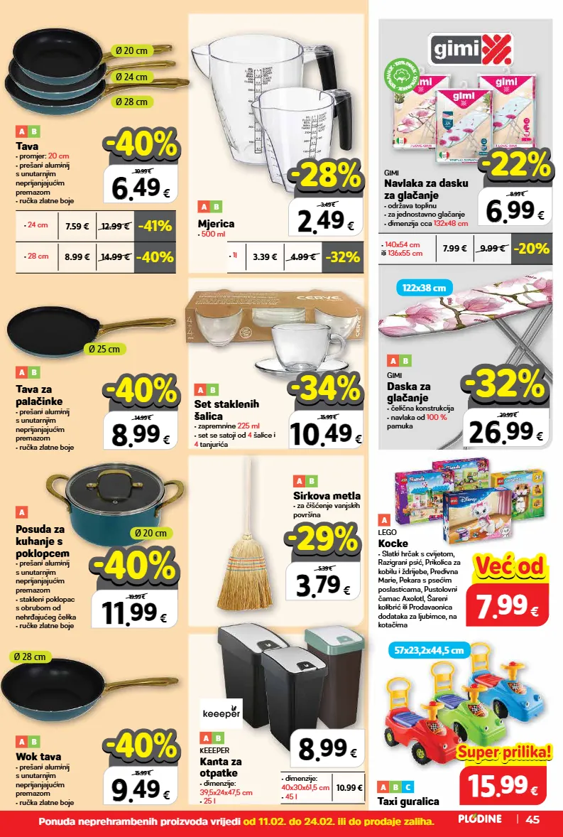 a b keeeper kanta za otpatke • dimenzije: 39,5x24x47,5 cm • 25 l 8 8 . . 99 99 € a b sirkova metla • za čišćenje vanjskih površina -32% 3.39 € 4.99 € • 1l top cijena! već od hit cijena! super prilika! 26 26 . . 99 99 € xxxxx samo u plodinama 39.99 € -32% -32% • dimenzije: 40x30x61,5 cm • 45 l 10.99 € 2 2 . . 49 49 € 3.49 € -28% -28% -41% 7.59 € 12.99 € • 24 cm -40% 8.99 € 14.99 € • 28 cm 6 6 . . 49 49 € 10.99 € -40% -40% 8 8 . . 99 99 € 14.99 € -40% -40% gimi navlaka za dasku za glačanje • održava toplinu • za jednostavno glačanje • dimenzija cca 132x48 cm 9 9 . . 49 49 € 15.99 € -40% -40% a b c taxi guralica top cijena! već od hit cijena! super prilika! 11 11 . . 99 99 € xxxxx samo u plodinama 19.99 € -40% -40% a lego kocke • slatki hrčak s cvijetom, razigrani psić, prikolica za kobilu i ždrijebe, predivna marie, pekara s psećim poslasticama, pustolovni čamac axolotl, šareni kolibrić ili prodavaonica dodataka za ljubimce, na kotačima 122x38 cm 57x23,2x44,5 cm top cijena! već od hit cijena! 7 7 . . 99 99 € već od već od 3 3 . . 79 79 € 5.39 € -29% -29% top cijena! već od hit cijena! 15 15 . . 99 99 € super prilika! super prilika! 10 10 . . 49 49 € 15.99 € -34% -34% 6 6 . . 99 99 € 8.99 € -22% -22% • 1 0 0 % p a m u k • 1 0 0 % p a m u k • 1 0 0 % p a m u k • 140x54 cm ili 136x55 cm -20% 7.99 € 9.99 € ponuda neprehrambenih proizvoda vrijedi od 11.02. do 24.02. ili do prodaje zaliha. ø 28 cm ø 20 cm ø 25 cm ø 28 cm ø 24 cm ø 20 cm 45 a posuda za kuhanje s poklopcem • prešani aluminij s unutarnjim neprijanjajućim premazom • stakleni poklopac s obrubom od nehrđajućeg čelika • ručke zlatne boje wok tava • prešani aluminij s unutarnjim neprijanjajućim premazom • ručka zlatne boje a b tava za palačinke • prešani aluminij s unutarnjim neprijanjajućim premazom • ručka zlatne boje a b tava • promjer: 20 cm • prešani aluminij s unutarnjim neprijanjajućim premazom • ručka zlatne boje a b a b set staklenih šalica • zapremnine 225 ml • set se satoji od 4 šalice i 4 tanjurića a b mjerica • 500 ml a b gimi daska za glačanje • čelična konstrukcija • navlaka od 100 % pamuka