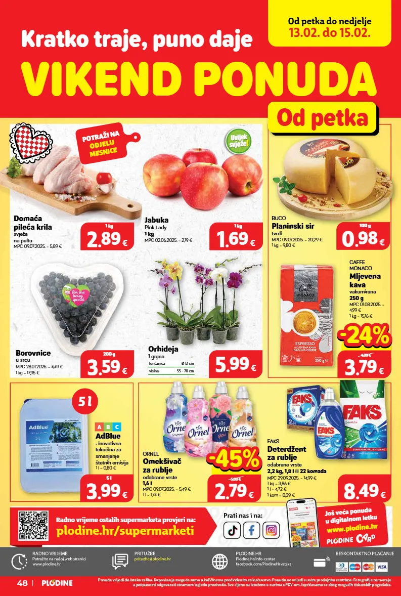 2 2 . . 89 89 € 1 kg još veća ponuda u digitalnom letku www.plodine.hr radno vrijeme ostalih supermarketa provjeri na: plodine.hr/supermarketi od petka do nedjelje 13.02. do 15.02. jabuka pink lady 1 kg mpc 02.06.2025. = 2,19 € borovnice u srcu mpc 28.01.2026. = 4,49 € 1 kg = 17,95 € vikend ponuda od petka kratko traje, puno daje domaća pileća krila svježa na pultu mpc 09.07.2025. = 5,89 € caffe monaco mljevena kava vakumirana 250 g mpc 01.08.2025. = 4,99 € 1 kg = 15,16 € faks deterdžent za rublje odabrane vrste 2,2 kg, 1,8 l ili 22 komada mpc 29.09.2025. = 14,99 € 1 kg = 3,86 € 1 l = 4,72 € 1 kom = 0,39 € buco planinski sir tvrdi mpc 09.07.2025. = 20,29 € 1 kg = 9,80 € ornel omekšivač za rublje odabrane vrste 1,6 l mpc 09.07.2025. = 5,49 € 1 l = 1,74 € 0 0 . . 98 98 € 100 g 8 8 . . 49 49 € 3 3 . . 99 99 € 5 l top cijena! već od hit cijena! super prilika! 3 3 . . 79 79 € xxxxx samo u plodinama 4.99 € -24% -24% a b c adblue • inovativna tekućina za smanjenje štetnih emisija 1 l = 0,80 € 2 2 . . 79 79 € 1,6 l 5.09 € -45% -45% 3 3 . . 59 59 € 200 g 1 1 . . 69 69 € 1 kg orhideja 1 grana lončanica ø 12 cm visina 55 - 70 cm 5 5 . . 99 99 € 5 l uvijek svježe ! potraži na odjelu mesnice 48