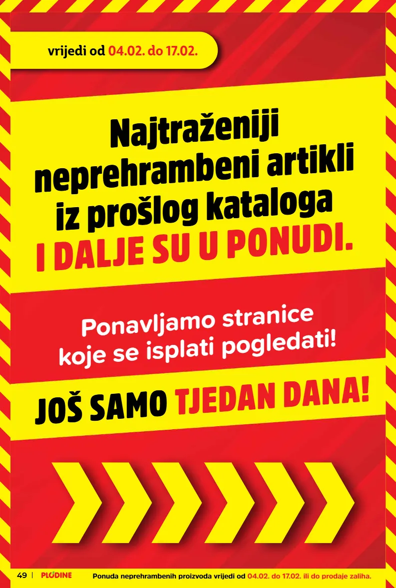 Ponuda neprehrambenih proizvoda vrijedi od 04.02. do 17.02. ili do prodaje zaliha. Ponavljamo stranice koje se isplati pogledati! JOŠ SAMO TJEDAN DANA! Najtraženiji neprehrambeni artikli iz prošlog kataloga I DALJE SU U PONUDI. vrijedi od 04.02. do 17.02. 49