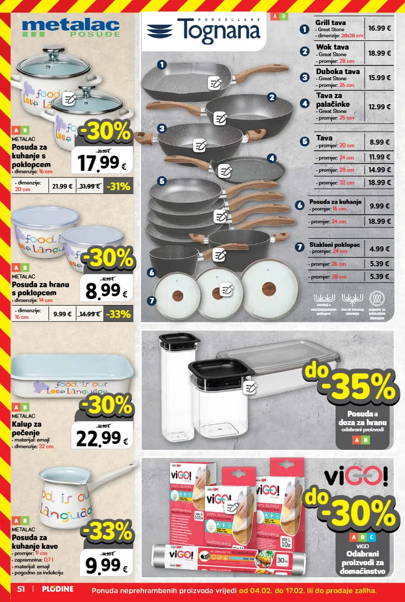 -31% 21.99 € 31.99 € • dimenzije: 20 cm -33% 9.99 € 14.99 € • dimenzije: 16 cm 9 9 . . 99 99 € 14.99 € -33% -33% top cijena! već od hit cijena! super prilika! 22 22 . . 99 99 € xxxxx samo u plodinama 32.99 € -30% -30% 8 8 . . 99 99 € 12.99 € -30% -30% top cijena! već od hit cijena! super prilika! 17 17 . . 99 99 € xxxxx samo u plodinama 25.99 € -30% -30% 16.99 € grill tava • great stone • dimenzije: 28x28 cm 18.99 € wok tava • great stone • promjer: 28 cm 15.99 € duboka tava • great stone • promjer: 26 cm 12.99 € tava za palačinke • great stone • promjer: 25 cm 8.99 € tava • promjer: 20 cm 11.99 € • promjer: 24 cm 14.99 € • promjer: 28 cm 18.99 € • promjer: 32 cm 9.99 € posuda za kuhanje • promjer: 16 cm 18.99 € • promjer: 24 cm 4.99 € stakleni poklopac • promjer: 24 cm 5.39 € • promjer: 26 cm 5.39 € • promjer: 28 cm 1 1 2 2 3 3 4 4 5 5 6 6 7 7 51 aluminij s neprijanjajućujom podlogom pogodno za indukcijske štednjake dno od kovanog aluminija do do -30% -30% a b c vigo odabrani proizvodi za domaćinstvo a b metalac posuda za kuhanje s poklopcem • dimenzije: 16 cm a b metalac posuda za hranu s poklopcem • dimenzije: 14 cm a b metalac kalup za pečenje • materijal: emajl • dimenzije: 32 cm a b metalac posuda za kuhanje kave • promjer: 11 cm • zapremnina: 0,7 l • materijal: emajl • pogodno za indukciju do do -35% -35% posuda ili doza za hranu odabrani proizvodi a b