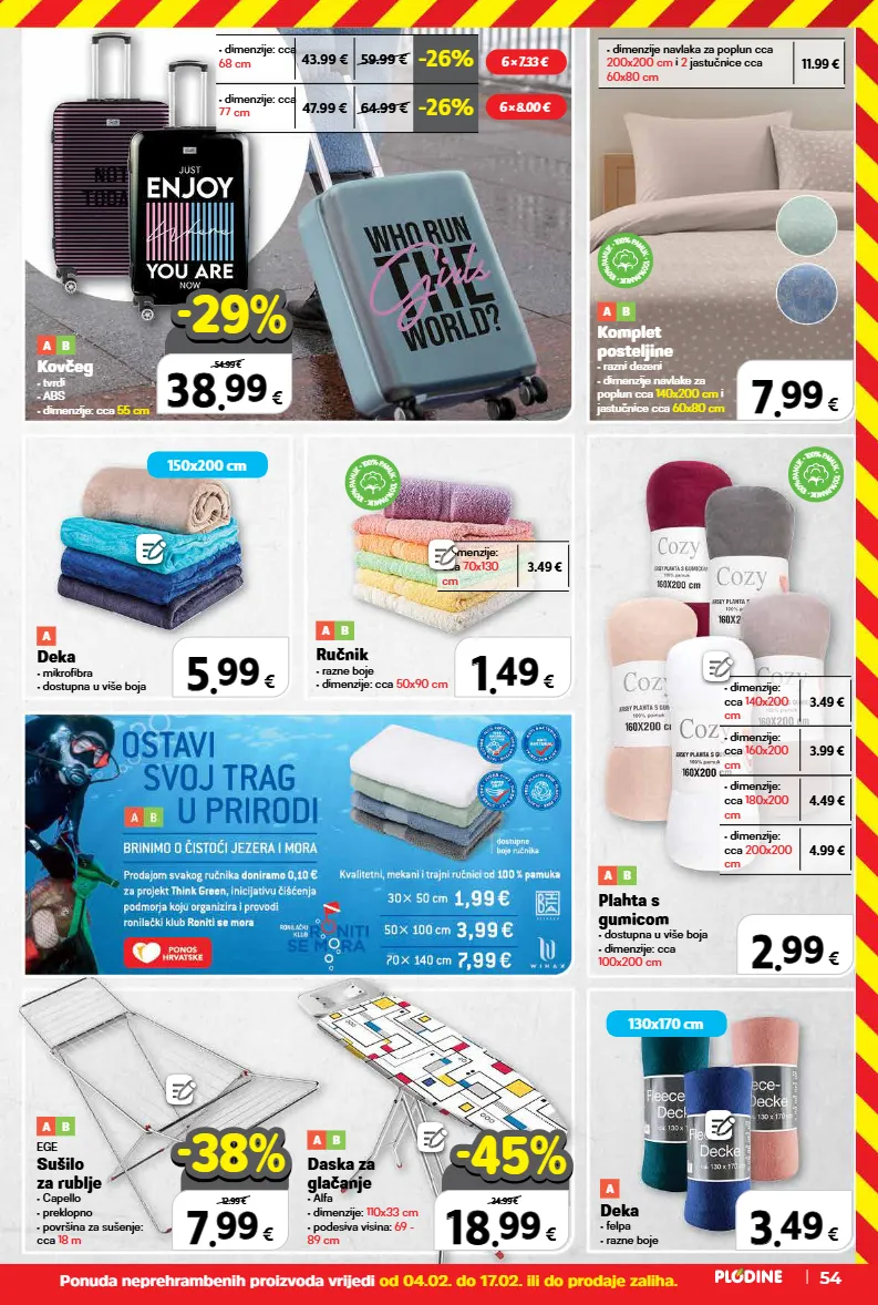 • dimenzije navlaka za poplun cca 200x200 cm i 2 jastučnice cca 60x80 cm 11.99 € • dimenzije: cca 70x130 cm 3.49 € • dimenzije: cca 180x200 cm 4.49 € • dimenzije: cca 200x200 cm 4.99 € • dimenzije: cca 160x200 cm 3.99 € • dimenzije: cca 140x200 cm 3.49 € 3 3 . . 49 49 € 1 1 . . 49 49 € 7 7 . . 99 99 € 2 2 . . 99 99 € 5 5 . . 99 99 € 6 × 7.33 € 6 × 8.00 € kovčeg • tvrdi • abs • dimenzije: cca 55 cm a b top cijena! već od hit cijena! super prilika! 38 38 . . 99 99 € xxxxx samo u plodinama 54.99 € -29% -29% 7 7 . . 99 99 € 12.99 € -38% -38% top cijena! već od hit cijena! super prilika! 18 18 . . 99 99 € xxxxx samo u plodinama 34.99 € -45% -45% ponuda neprehrambenih proizvoda vrijedi od 04.02. do 17.02. ili do prodaje zaliha. • 1 0 0 % p a m u k • 1 0 0 % p a m u k • 1 0 0 % p a m u k • 1 0 0 % p a m u k • 1 0 0 % p a m u k • 1 0 0 % p a m u k • 1 0 0 % p a m u k • 1 0 0 % p a m u k • 1 0 0 % p a m u k 130x170 cm 150x200 cm 54 -26% 43.99 € 59.99 € • dimenzije: cca 68 cm -26% 47.99 € 64.99 € • dimenzije: cca 77 cm ručnik • razne boje • dimenzije: cca 50x90 cm a b plahta s gumicom • dostupna u više boja • dimenzije: cca 100x200 cm a b komplet posteljine • razni dezeni • dimenzije navlake za poplun cca 140x200 cm i jastučnice cca 60x80 cm a b deka • mikrofibra • dostupna u više boja a deka • felpa • razne boje a daska za glačanje • alfa • dimenzije: 110x33 cm • podesiva visina: 69 - 89 cm a b ege sušilo za rublje • capello • preklopno • površina za sušenje: cca 18 m a b