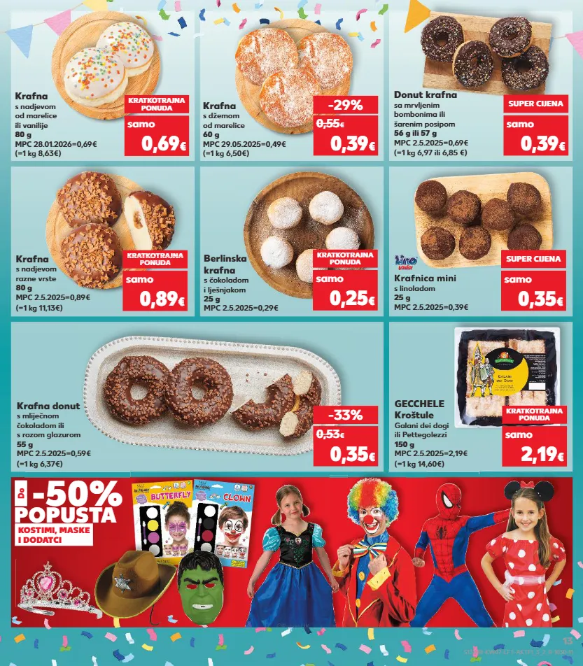 kratkotrajna ponuda kratkotrajna ponuda samo kratkotrajna ponuda kratkotrajna ponuda samo donut krafna sa mrvljenim bombonima ili šarenim posipom 56 g ili 57 g mpc 2.5.2025=0,69€ (=1 kg 6,97 ili 6,85 €) samo super cijena 0,39 € krafna s nadjevom razne vrste 80 g mpc 2.5.2025=0,89€ (=1 kg 11,13€) kratkotrajna ponuda samo kratkotrajna ponuda super cijena kratkotrajna super cijena kratkotrajna ponuda super cijena onuda 0,89 € berlinska krafna s čokoladom i lješnjakom 25 g mpc 2.5.2025=0,29€ kratkotrajna ponuda samo 0,25 € krafna donut s mliječnom čokoladom ili s rozom glazurom 55 g mpc 2.5.2025=0,59€ (=1 kg 6,37€) -33% 0,35 € 0,53 € krafnica mini s linoladom 25 g mpc 2.5.2025=0,39€ krafnica mini samo super cijena 0,35 € gecchele kroštule galani dei dogi ili pettegolezzi 150 g mpc 2.5.2025=2,19€ (=1 kg 14,60€) kratkotrajna ponuda samo 2,19 € (=1 kg 6,50€) krafna s džemom od marelice 60 g mpc 29.05.2025=0,49€ -29% 0,39 € 0,55 € (=1 kg 8,63€) krafna s nadjevom od marelice ili vanilije 80 g mpc 28.01.2026=0,69€ kratkotrajna ponuda samo 0,69 € -50% popusta kostimi, maske i dodatci do s13-hr-kw07-lft-aktf1_3_2_r-1030-11 13