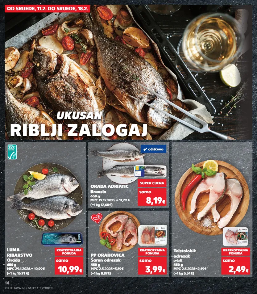 kratkotrajna ponuda od srijede, 11.2. do srijede, 18.2. orada adriatic brancin 650 g mpc 19.12.2025 = 11,29 € (=1 kg 12,60€) pp orahovica šaran odrezak 450 g mpc 2.5.2025=3,59€ (=1 kg 8,87€) tolstolobik odrezak svježi 450 g mpc 2.5.2025=2,49€ (=1 kg 5,54€) luma ribarstvo orada 650 g mpc 29.1.2026.= 10,99€ (=1 kg 16,91 €) super cijena samo 8,19 € kratkotrajna ponuda samo 3,99 € kratkotrajna ponuda samo 10,99 € kratkotrajna ponuda samo 2,49 € ✓ očišćeno ukusan riblji zalogaj s14-hr-kw07-lft-aktf1_4_1_l-1030-11 14