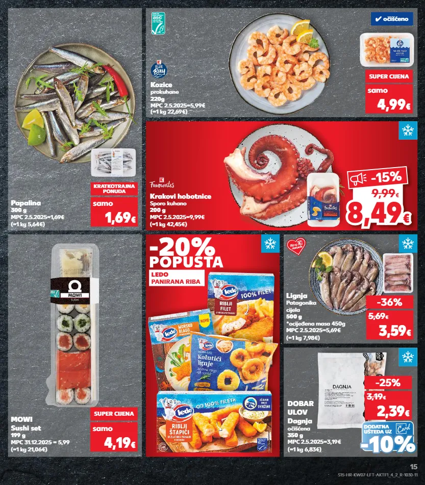 kratkotrajna ponuda kratkotrajna ponuda samo kratkotrajna ponuda kratkotrajna ponuda samo ledo panirana riba -20% popusta popusta papalina 300 g mpc 2.5.2025=1,69€ (=1 kg 5,64€) krakovi hobotnice sporo kuhano 200 g mpc 2.5.2025=9,99€ (=1 kg 42,45€) kratkotrajna ponuda samo 1,69 € mowi sushi set 199 g mpc 31.12.2025 = 5,99 (=1 kg 21,06€) samo super cijena 4,19 € lignja patagonika cijela 500 g *ocijeđena masa 450g mpc 2.5.2025=5,69€ (=1 kg 7,98€) -36% 3,59 € 5,69 € (=1 kg 22,69€) kozice prokuhane 220g mpc 2.5.2025=5,99€ samo super cijena 4,99 € dodatna ušteda uz (=1 kg 6,83€) dobar ulov dagnja očišćena 350 g mpc 2.5.2025=3,19€ -25% 2,39 € 3,19 € - - 10% 10% ✓ očišćeno 8,4 9 8,49 € € -15% 9,99 € s15-hr-kw07-lft-aktf1_4_2_r-1030-11 15