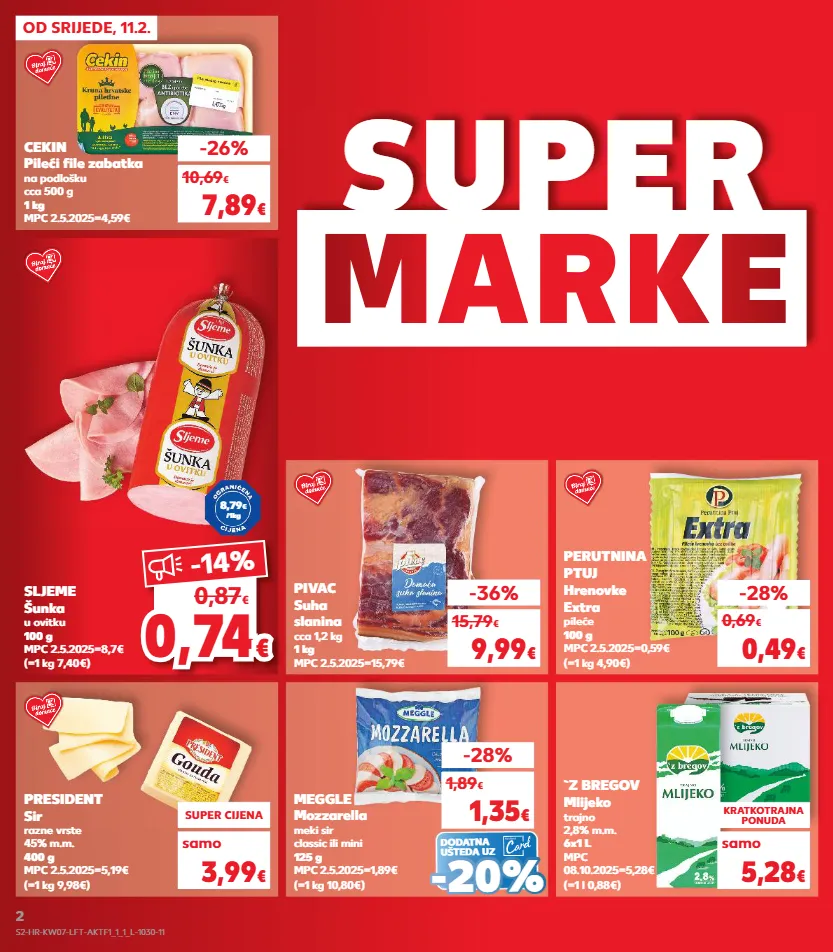 kratkotrajna ponuda samo kratkotrajna ponuda samo samo kratkotrajna ponuda samo kratkotrajna ponuda samo kratkotrajna ponuda samo super marke od srijede, 11.2. president sir razne vrste 45% m.m. 400 g mpc 2.5.2025=5,19€ (=1 kg 9,98€) perutnina ptuj hrenovke extra pileće 100 g mpc 2.5.2025=0,59€ (=1 kg 4,90€) `z bregov mlijeko trajno 2,8% m.m. 6x1 l mpc 08.10.2025=5,28€ (=1 l 0,88€) -28% 0,49 € 0,69 € super cijena 3,99 € samo kratkotrajna ponuda 5,28 € samo -36% 9,99 € 15,79 € pivac suha slanina cca 1,2 kg 1 kg mpc 2.5.2025=15,79€ -26% 7,89 € 10,69 € cekin pileći file zabatka na podlošku cca 500 g 1 kg mpc 2.5.2025=4,59€ (=1 kg 7,40€) sljeme šunka u ovitku 100 g mpc 2.5.2025=8,7€ dodatna ušteda uz (=1 kg 10,80€) meggle mozzarella meki sir classic ili mini 125 g mpc 2.5.2025=1,89€ -28% 1,35 € 1,89 € - - 20 % 20 % 8,79 € /1kg 0, 0, 74 74 € € -14% 0,87 € s2-hr-kw07-lft-aktf1_1_1_l-1030-11 2