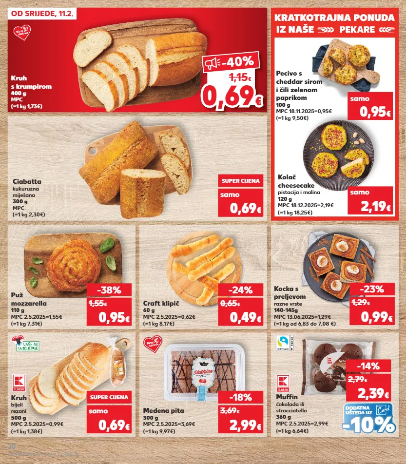kratkotrajna ponuda kratkotrajna ponuda kratkotrajna ponuda kratkotrajna ponuda kratkotrajna ponuda kratkotrajna ponuda kratkotrajna ponuda samo kratkotrajna ponuda iz naše pekare od srijede, 11.2. od srijede, 11.2. pekare craft klipić 60 g mpc 2.5.2025=0,62€ (=1 kg 8,17€) puž mozzarella 110 g mpc 2.5.2025=1,55€ (=1 kg 7,31€) kolač cheesecake pistacija i malina 120 g mpc 18.12.2025=2,19€ (=1 kg 18,25€) kruh bijeli rezani 500 g mpc 2.5.2025=0,99€ (=1 kg 1,38€) medena pita 300 g mpc 2.5.2025=3,69€ (=1 kg 9,97€) -38% 0,95 € 1,55 € -24% 0,49 € 0,65 € kocka s preljevom razne vrste 140-145g mpc 13.06.2025=1,29€ (=1 kg od 6,83 do 7,08 €) -23% 0,99 € 1,29 € samo super cijena 0,69 € -18% 2,99 € 3,69 € 2,19 € 0,95 € (=1 kg 9,50€) pecivo s cheddar sirom i čili zelenom paprikom 100 g mpc 18.11.2025=0,95€ (=1 kg 1,73€) kruh s krumpirom 400 g mpc super cijena 0,69 € (=1 kg 2,30€) ciabatta kukuruzna miješana 300 g mpc dodatna ušteda uz (=1 kg 6,64€) muffin čokolada ili stracciatella 360 g mpc 2.5.2025=2,99€ -14% 2,39 € 2,79 € - - 10% 10% 0,6 9 0,69 € € -40% 1,15 € samo samo samo s20-hr-kw07-lft-frp_1_1_l-1030-11 20