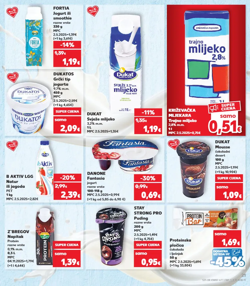 kratkotrajna ponuda kratkotrajna ponuda kratkotrajna ponuda kratkotrajna ponuda kratkotrajna ponuda kratkotrajna ponuda kratkotrajna ponuda kratkotrajna ponuda dukatos grčki tip jogurta 9,7% m.m. 450 g mpc 2.5.2025=2,59€ (=1 kg 4,65€) b aktiv lgg natur ili jagoda pet 1 kg mpc 2.5.2025=2,82€ -20% 2,39 € 2,99 € super cijena 2,09 € danone fantasia jogurt razne vrste 100-118 g mpc 2.5.2025=0,99€ (=1 kg od 5,85 do 6,90 €) dukat mousse čokoladni desert 100 g mpc 2.5.2025=1,19€ (=1 kg 10,90€) z`bregov napitak protein razne vrste 0,1% m.m. 0,3 l mpc 04.11.2025=1,79€ (=1 l 4,64€) -30% 0,69 € 0,99 € super cijena 1,09 € super cijena 1,39 € stay strong pro puding razne vrste 200 g mpc 2.5.2025=1,49€ (=1 kg 4,75€) samo super cijena 0,95 € dukat svježe mlijeko 3,2% m.m. 1 l mpc 2.5.2025=1,35€ -11% 1,19 € 1,35 € (=1 kg 3,61€) fortia jogurt ili smoothie razne vrste 330 g mpc 2.5.2025=1,39€ -14% 1,19 € 1,39 € križevačka mljekara trajno mlijeko 2,8% m.m. 1 l mpc 2.5.2025=0,75€ (=1 kg 33,80€) proteinska pločica čokolada i lješnjak 50 g mpc 2.5.2025=1,69€ samo 1,69 € - - 45 % 45 % dodatna ušteda uz samo samo samo 0,5 1 0,51 € € samo super cijena s21-hr-kw07-lft-frp_1_2_r-1030-11 21