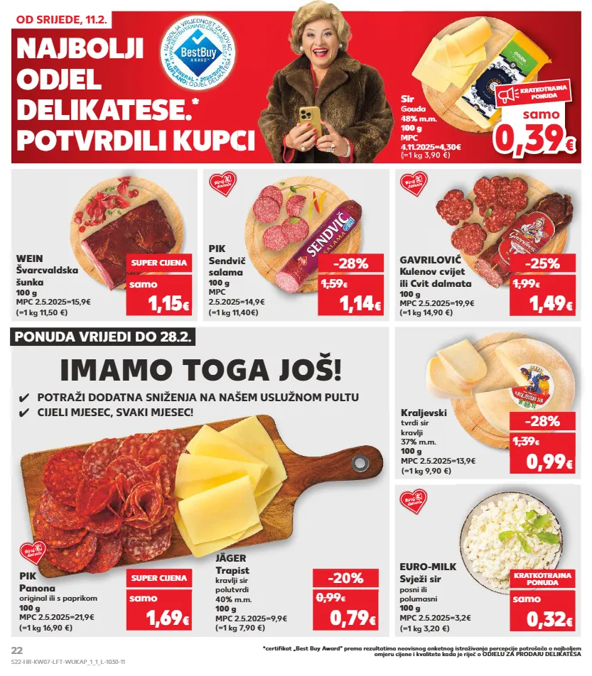 kratkotrajna ponuda kratkotrajna ponuda kratkotrajna ponuda kratkotrajna ponuda kratkotrajna ponuda kratkotrajna ponuda *certifi kat „best buy award“ prema rezultatima neovisnog anketnog istraživanja percepcije potrošača o najboljem omjeru cijene i kvalitete kada je riječ o odjelu za prodaju delikatesa od srijede, 11.2. ✓ potraži dodatna sniženja na našem uslužnom pultu ✓ cijeli mjesec, svaki mjesec! ponuda vrijedi do 28.2. imamo toga još! pik panona original ili s paprikom 100 g mpc 2.5.2025=21,9€ (=1 kg 16,90 €) jäger trapist kravlji sir polutvrdi 40% m.m. 100 g mpc 2.5.2025=9,9€ (=1 kg 7,90 €) 0,3 9 0,39 € € samo kratkotrajna ponuda sir gouda 48% m.m. 100 g mpc 4.11.2025=4,30€ (=1 kg 3,90 €) euro-milk svježi sir posni ili polumasni 100 g mpc 2.5.2025=3,2€ (=1 kg 3,20 €) kratkotrajna ponuda samo 0,32 € kraljevski tvrdi sir kravlji 37% m.m. 100 g mpc 2.5.2025=13,9€ (=1 kg 9,90 €) -28% 0,99 € 1,39 € samo super cijena 1,69 € -20% 0,79 € 0,99 € -25% 1,49 € 1,99 € (=1 kg 14,90 €) gavrilović kulenov cvijet ili cvit dalmata 100 g mpc 2.5.2025=19,9€ samo super cijena 1,15 € (=1 kg 11,50 €) wein švarcvaldska šunka 100 g mpc 2.5.2025=15,9€ -28% 1,14 € 1,59 € (=1 kg 11,40€) pik sendvič salama 100 g mpc 2.5.2025=14,9€ najbolji odjel delikatese. * potvrdili kupci sir gouda 48% m.m. 100 g mpc 4.11.2025=4,30€ (=1 kg 3,90 €) potvrdili kupci s22-hr-kw07-lft-wukap_1_1_l-1030-11 22