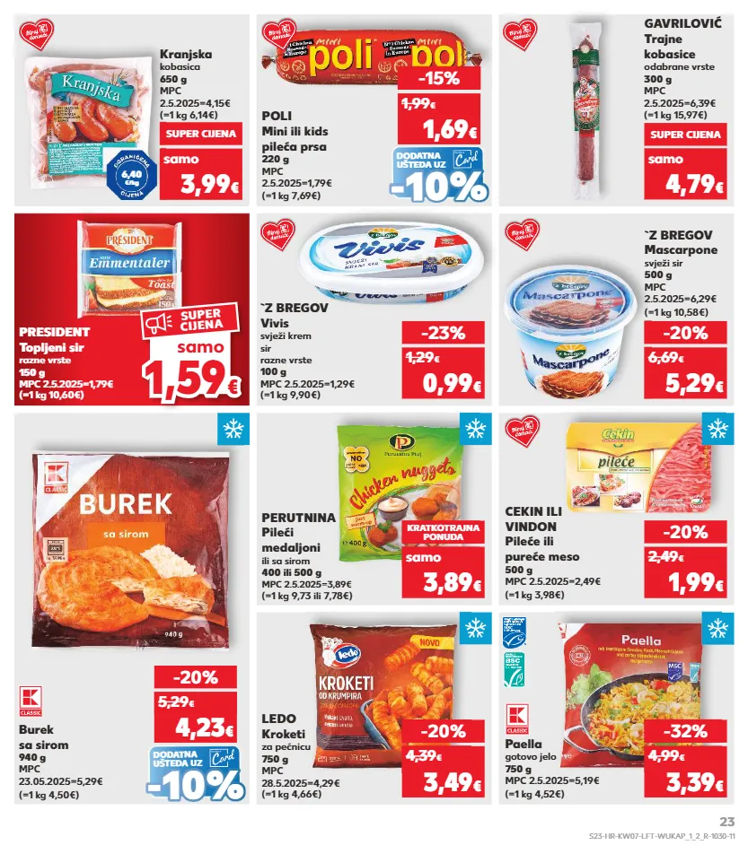 kratkotrajna ponuda kratkotrajna ponuda kratkotrajna ponuda kratkotrajna ponuda kratkotrajna ponuda kratkotrajna ponuda kratkotrajna ponuda kratkotrajna ponuda samo kratkotrajna ponuda samo president topljeni sir razne vrste 150 g mpc 2.5.2025=1,79€ (=1 kg 10,60€) `z bregov mascarpone svježi sir 500 g mpc 2.5.2025=6,29€ (=1 kg 10,58€) `z bregov vivis svježi krem sir razne vrste 100 g mpc 2.5.2025=1,29€ (=1 kg 9,90€) -23% 0,99 € 1,29 € -20% 5,29 € 6,69 € perutnina pileći medaljoni ili sa sirom 400 ili 500 g mpc 2.5.2025=3,89€ (=1 kg 9,73 ili 7,78€) cekin ili vindon pileće ili pureće meso 500 g mpc 2.5.2025=2,49€ (=1 kg 3,98€) kratkotrajna ponuda samo 3,89 € -20% 1,99 € 2,49 € ledo kroketi za pećnicu 750 g mpc 28.5.2025=4,29€ (=1 kg 4,66€) paella gotovo jelo 750 g mpc 2.5.2025=5,19€ (=1 kg 4,52€) -20% 3,49 € 4,39 € -32% 3,39 € 4,99 € (=1 kg 15,97€) gavrilović trajne kobasice odabrane vrste 300 g mpc 2.5.2025=6,39€ samo super cijena 4,79 € (=1 kg 6,14€) kranjska kobasica 650 g mpc 2.5.2025=4,15€ samo super cijena 3,99 € 6,40 €/kg dodatna ušteda uz (=1 kg 4,50€) burek sa sirom 940 g mpc 23.05.2025=5,29€ -20% 4,23 € 5,29 € - - 10% 10% dodatna ušteda uz (=1 kg 7,69€) poli mini ili kids pileća prsa 220 g mpc 2.5.2025=1,79€ -15% 1,69 € 1,99 € - - 10% 10% 1,5 9 1,59 € € samo super cijena s23-hr-kw07-lft-wukap_1_2_r-1030-11 23