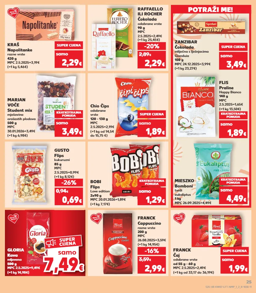 samo kratkotrajna ponuda kratkotrajna ponuda kratkotrajna ponuda kratkotrajna ponuda kratkotrajna ponuda kratkotrajna ponuda kratkotrajna ponuda potraži me! marjan voće student mix mješavina orašastih plodova 500 g mpc 30.01.2026=3,49€ (=1 kg 6,98€) zanzibar čokolada mliječna s lješnjacima gianduia 150 g mpc 24.12.2025=3,99€ (=1 kg 23,27€) kratkotrajna ponuda samo 3,49 € bobi flips love edition 2x90 g mpc 20.01.2026=1,89€ (=1 kg 7,17€) kratkotrajna ponuda 1,29 € samo super cijena 3,49 € gusto flips kukuruzni 85 g mpc 2.5.2025=0,99€ (=1 kg 8,12€) flis praline happy bianco 140 g mpc 2.5.2025=1,65€ (=1 kg 13,50€) kraš napolitanke razne vrste 420 g mpc 2.5.2025=3,19€ (=1 kg 5,46€) super cijena 2,29 € -26% 0,69 € 0,94 € kratkotrajna ponuda 1,89 € gloria kava mljevena 500 g mpc 2.5.2025=9,49€ (=1 kg 14,98€) franck cappuccino razne vrste 200 g mpc 26.08.2025=3,59€ (=1 kg 14,95€) franck čaj odabrane vrste od 55 g - 60 g mpc 2.5.2025=2,49€ (=1 kg od 33,17 do 36,19€) -16% 2,99 € 3,59 € super cijena 1,99 € (=1 kg 25,45€) raffaello ili rocher čokolada odabrane vrste 90 g mpc 2.5.2025=2,49€ -20% 2,29 € 2,89 € (=1 kg 4,49€) mieszko bomboni tvrdi eukaliptus 1 kg mpc 26.09.2025=4,49€ kratkotrajna ponuda 4,49 € (=1 kg od 14,54 do 15,75 €) chio čips odabrane vrste 120 - 130 g mpc 2.5.2025=2,19€ super cijena samo 1,89 € sa o 1,89 sam 1,89 sam 1,8 sam 1,89 sam samo o € o 1,89 € samo samo samo samo samo 7,4 9 7,49 € € samo super cijena s25-hr-kw07-lft-nmp_1_2_r-1030-11 25