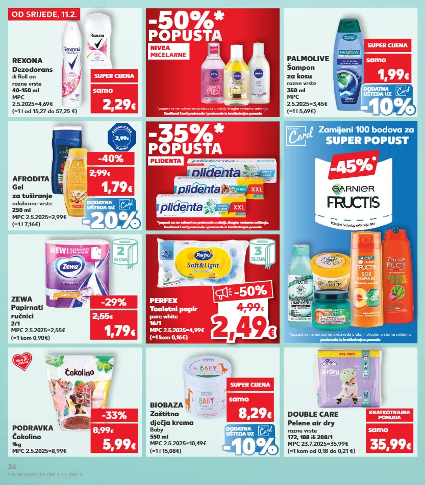 kratkotrajna ponuda kratkotrajna ponuda kratkotrajna ponuda kratkotrajna ponuda kratkotrajna ponuda samo kratkotrajna ponuda od srijede, 11.2. kratkotrajna ponuda 35,99 € (=1 kom od 0,18 do 0,21 €) double care pelene air dry razne vrste 172, 188 ili 208/1 mpc 23.7.2025=35,99€ -33% 5,99 € 8,99 € podravka čokolino 1kg mpc 2.5.2025=8,99€ od srijede, 11.2. (=1 l od 15,27 do 57,25 €) rexona dezodorans ili roll on razne vrste 40-150 ml mpc 2.5.2025=4,69€ super cijena samo 2,29 € palmolive šampon za kosu razne vrste 350 ml mpc 2.5.2025=3,45€ (=1 l 5,69€) samo super cijena 1,99 € dodatna ušteda uz - - 10% 10% dodatna ušteda uz (=1 l 15,08€) biobaza zaštitna dječja krema baby 550 ml mpc 2.5.2025=10,49€ super cijena samo samo 8,29 € - - 10% 10% plidenta -35% popusta popusta dodatna ušteda uz (=1 l 7,16€) afrodita gel za tuširanje odabrane vrste 250 ml mpc 2.5.2025=2,99€ -40% 1,79 € 2,99 € - - 20 % 20 % 2,99 € zewa papirnati ručnici 2/1 mpc 2.5.2025=2,55€ (=1 kom 0,90€) -29% 1,79 € 2,55 € 2 sloja perfex toaletni papir pure white 16/1 mpc 2.5.2025=4,99€ (=1 kom 0,16€) 3 sloja nivea micelarne -50% popusta popusta *popust se ne odnosi na proizvode u akciji, drugim vrstama sniženja, kaufland card proizvode i proizvode iz kratkotrajne ponude *popust se ne odnosi na proizvode u akciji, drugim vrstama sniženja, kaufland card proizvode i proizvode iz kratkotrajne ponude * * popusta *popust se ne odnosi na proizvode u akciji, drugim vrstama sniženja, zamijeni 100 bodova za super popust *popust se ne odnosi na proizvode u akciji, drugim vrstama sniženja, proizvode iz kratkotrajne ponude -45% * *popust se ne odnosi na proizvode u akciji, drugim vrstama sniženja, 2,4 9 2,49 € € -50% 4,99 € s26-hr-kw07-lft-drp_1_1_l-1030-11 26