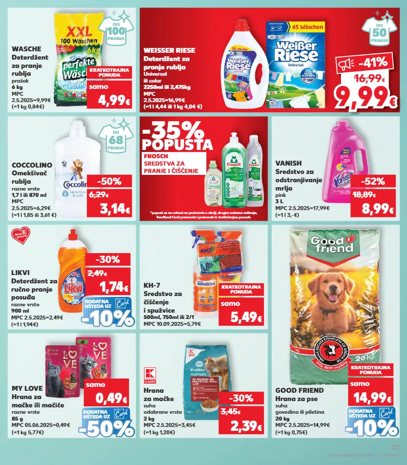 kratkotrajna ponuda kratkotrajna ponuda kratkotrajna ponuda samo kratkotrajna ponuda 100 pranja do vanish sredstvo za odstranjivanje mrlja pink 3 l mpc 2.5.2025=17,99€ (=1 l 3,-€) -52% 8,99 € 18,89 € kh-7 sredstvo za čišćenje i spužvice 500ml, 750ml ili 2/1 mpc 10.09.2025=5,79€ kratkotrajna ponuda 5,49 € hrana za mačke suha odabrane vrste 2 kg mpc 2.5.2025=3,45€ (=1 kg 1,20€) good friend hrana za pse suha govedina ili piletina 20 kg mpc 2.5.2025=14,99€ (=1 kg 0,75€) kratkotrajna ponuda samo 14,99 € -30% 2,39 € 3,45 € (=1 l 4,44 ili 1 kg 4,04 €) weisser riese deterdžent za pranje rublja universal ili color 2250ml ili 2,475kg mpc 2.5.2025=16,99€ (=1 kg 0,84€) wasche deterdžent za pranje rublja prašak 6 kg mpc 2.5.2025=9,99€ kratkotrajna ponuda samo 4,99 € dodatna ušteda uz (=1 l 1,94€) likvi deterdžent za ručno pranje posuđa razne vrste 900 ml mpc 2.5.2025=2,49€ -30% 1,74 € 2,49 € - - 10% 10% (=1 kg 5,77€) my love hrana za mačke ili mačiće razne vrste 85 g mpc 05.06.2025=0,49€ samo samo 0,49 € - - 50% 50% dodatna ušteda uz - - 10% 10% dodatna ušteda uz frosch sredstva za pranje i čišćenje -35% popusta *popust se ne odnosi na proizvode u akciji, drugim vrstama sniženja, kaufland card proizvode i proizvode iz kratkotrajne ponude 9,99 9,99 € € -41 % 16,99 € coccolino omekšivač rublja razne vrste 1,7 l ili 870 ml mpc 2.5.2025=6,29€ (=1 l 1,85 ili 3,61 €) -50% 3,14 € 6,29 € do 68 pranja do 50 pranja s27-hr-kw07-lft-drp_1_2_r-1030-11 27
