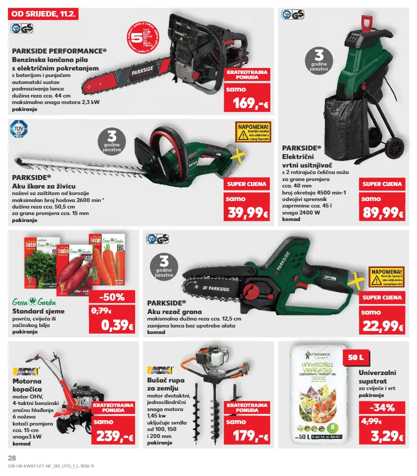 samo kratkotrajna ponuda samo kratkotrajna ponuda samo kratkotrajna ponuda samo od srijede, 11.2. super cijena 39,99 € samo parkside performance ® benzinska lančana pila s električnim pokretanjem s baterijom i punjačem automatski sustav podmazivanja lanca dužina reza cca. 44 cm maksimalna snaga motora 2,3 kw pakiranje parkside ® aku škare za živicu noževi sa zaštitom od korozije maksimalan broj hodova 2600 min - ¹ dužina reza cca. 50,5 cm za grane promjera cca. 15 mm pakiranje kratkotrajna ponuda samo 169,- € parkside ® aku rezač grana makismalna dužina reza cca. 12,5 cm zamjena lanca bez upotrebe alata komad super cijena samo 22,99 € bušač rupa za zemlju motor dvotaktni, jednocilindrični snaga motora 1,45 kw uključuje svrdla od 100, 150 i 200 mm pakiranje kratkotrajna ponuda samo 179,- € motorna kopačica motor ohv, 4-taktni benzinski zračno hlađenje 6 noževa kotači promjera cca. 15 cm snaga3 kw komad kratkotrajna ponuda samo 239,- € standard sjeme povrća, cvijeća ili začinskog bilja pakiranje -50% 0,39 € 0,79 € univerzalni supstrat za cvijeće i vrt pakiranje -34% 3,29 € 4,99 € 50 l 3 parkside ® električni vrtni usitnjivač s 2 rotirajuća čelična noža za grane promjera cca. 40 mm broj okretaja 4500 min-1 odvojivi spremnik zaprmnine cca. 45 l snaga 2400 w komad super cijena 89,99 € samo 3 3 s28-hr-kw07-lft-nf_sri_uto_1_l-1030-11 28