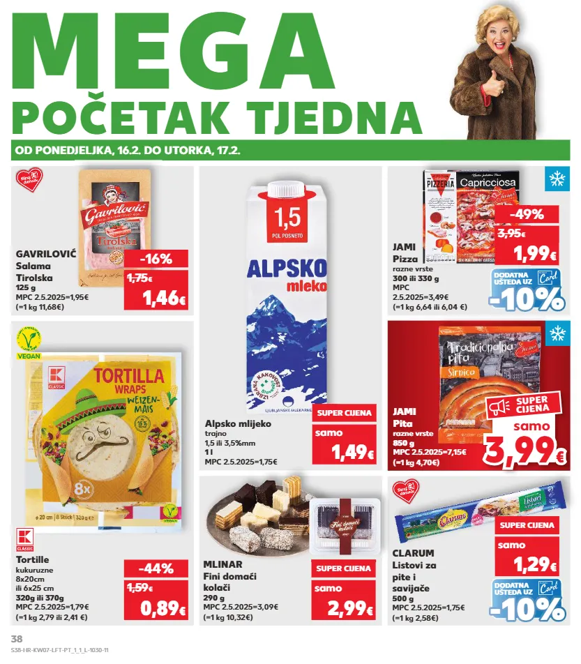 kratkotrajna ponuda kratkotrajna ponuda kratkotrajna ponuda kratkotrajna ponuda kratkotrajna ponuda kratkotrajna ponuda samo od ponedjeljka, 16.2. do utorka, 17.2. početak tjedna mega alpsko mlijeko trajno 1,5 ili 3,5%mm 1 l mpc 2.5.2025=1,75€ gavrilović salama tirolska 125 g mpc 2.5.2025=1,95€ (=1 kg 11,68€) jami pita razne vrste 850 g mpc 2.5.2025=7,15€ (=1 kg 4,70€) tortille kukuruzne 8x20cm ili 6x25 cm 320g ili 370g mpc 2.5.2025=1,79€ (=1 kg 2,79 ili 2,41 €) mlinar fini domaći kolači 290 g mpc 2.5.2025=3,09€ (=1 kg 10,32€) -16% 1,46 € 1,75 € samo super cijena 1,49 € samo super cijena 2,99 € -44% 0,89 € 1,59 € dodatna ušteda uz (=1 kg 2,58€) clarum listovi za pite i savijače 500 g mpc 2.5.2025=1,75€ samo super cijena 1,29 € - - 10% 10% dodatna ušteda uz (=1 kg 6,64 ili 6,04 €) jami pizza razne vrste 300 ili 330 g mpc 2.5.2025=3,49€ -49% 1,99 € 3,95 € - - 10% 10% 3,99 3,99 € € samo super cijena s38-hr-kw07-lft-pt_1_1_l-1030-11 38