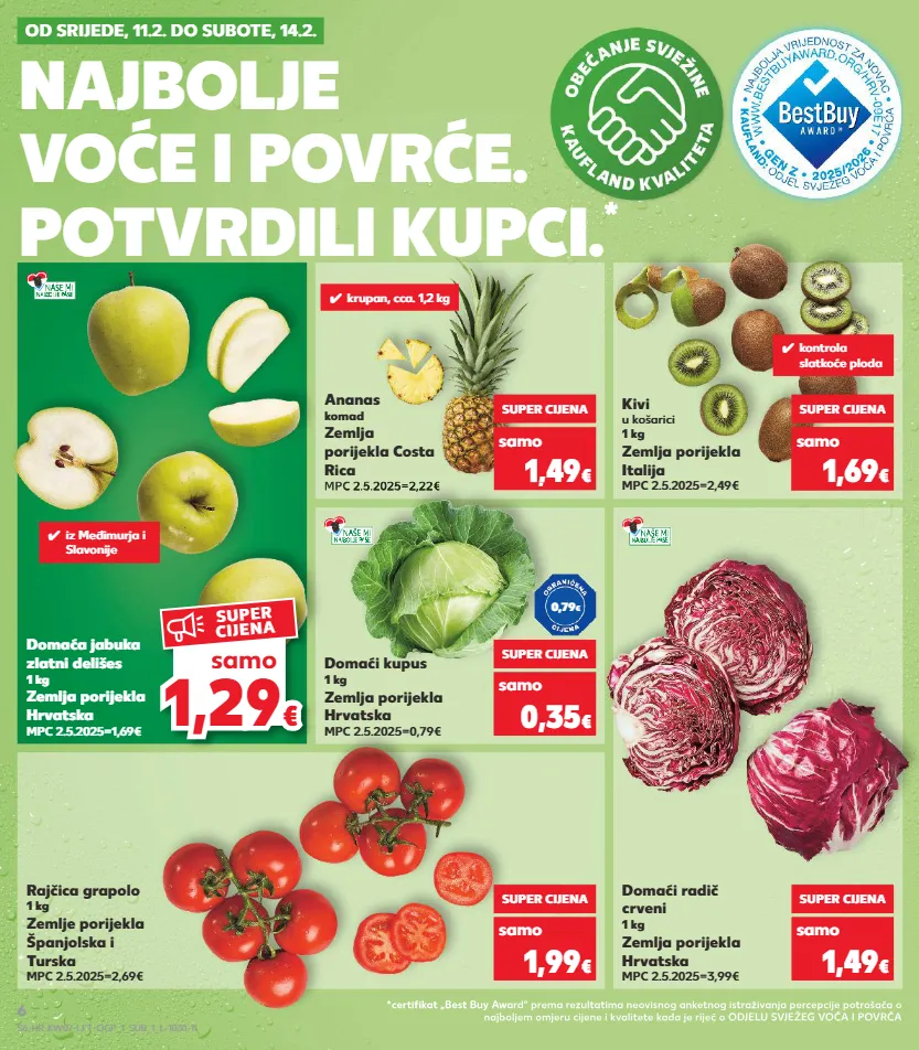 od srijede, 11.2. do subote, 14.2. *certifikat „best buy award“ prema rezultatima neovisnog anketnog istraživanja percepcije potrošača o najboljem omjeru cijene i kvalitete kada je riječ o odjelu svježeg voća i povrća *certifikat „best buy award“ prema rezultatima neovisnog anketnog istraživanja percepcije potrošača o najboljem omjeru cijene i kvalitete kada je riječ o odjelu svježeg voća i povrća rajčica grapolo 1 kg zemlje porijekla španjolska i turska mpc 2.5.2025=2,69€ domaći radič crveni 1 kg zemlja porijekla hrvatska mpc 2.5.2025=3,99€ samo 1,99 € samo 1,49 € super cijena super cijena super cijena super cijena samo 1,69 € kivi u košarici 1 kg zemlja porijekla italija mpc 2.5.2025=2,49€ domaća jabuka zlatni delišes 1 kg zemlja porijekla hrvatska mpc 2.5.2025=1,69€ samo 1,49 € ananas komad zemlja porijekla costa rica mpc 2.5.2025=2,22€ 1,49 mpc 2.5.2025=2,22€ super cijena domaći kupus 1 kg zemlja porijekla hrvatska mpc 2.5.2025=0,79€ samo 0,35 € 0,79 € 1,29 1,29 € € samo super cijena najbolje voće i povrće. potvrdili kupci. * * ✓ iz međimurja i slavonije ✓ krupan, cca. 1,2 kg ✓ kontrola slatkoće ploda s6-hr-kw07-lft-ogp_1_sub_1_l-1030-11 6