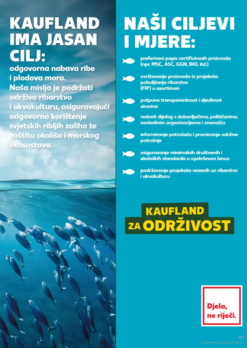 NAŠI CILJEVI I MJERE: preferirani popis certificiranih proizvoda (npr. MSC, ASC, GGN, BIO, itd.) uvrštavanje proizvoda iz projekata poboljšanja ribarstva (FIP) u asortiman potpuna transparentnost i sljedivost sirovina redovit dijalog s dobavljačima, političarima, nevladinim organizacijama i znanošću informiranje potrošača i promicanje održive potrošnje osiguravanje minimalnih društvenih i ekoloških standarda u opskrbnom lancu podržavanje projekata vezanih uz ribarstvo i akvakulturu KAUFLAND IMA JASAN CILJ: odgovorna nabava ribe i plodova mora. Naša misija je podržati održivo ribarstvo i akvakulturu, osiguravajući odgovorno korištenje svjetskih ribljih zaliha te zaštitu okoliša i morskog ekosustava. S13-HR-KW07-OC1-IMAGE2-1030-04 13