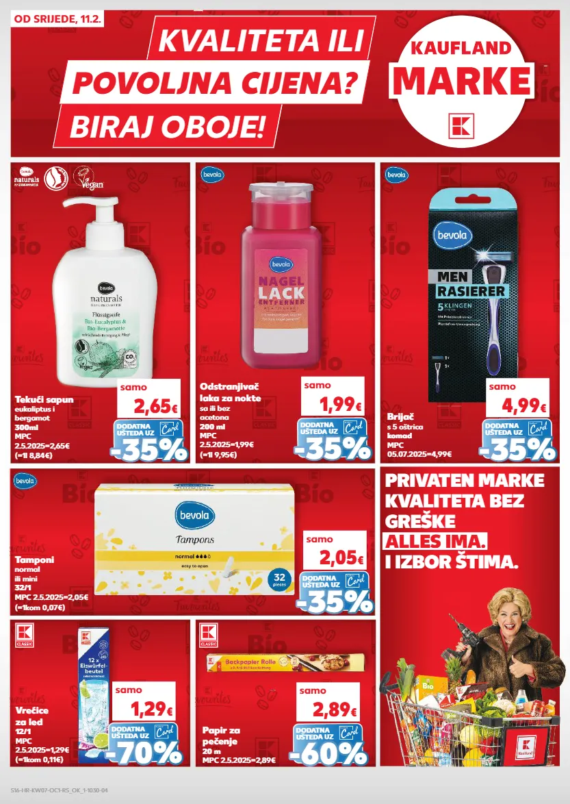 alles ima. i izbor štima. privaten marke kvaliteta bez greške marke biraj oboje! kvaliteta ili povoljna cijena? od srijede, 11.2. samo 2,05 € samo 4,99 € brijač s 5 oštrica komad mpc 05.07.2025=4,99€ (=1kom 0,07€) tamponi normal ili mini 32/1 mpc 2.5.2025=2,05€ - - 35 % 35 % dodatna ušteda uz - - 35 % 35 % dodatna ušteda uz samo 1,99 € samo 2,65 € (=1l 9,95€) odstranjivač laka za nokte sa ili bez acetona 200 ml mpc 2.5.2025=1,99€ (=1l 8,84€) tekući sapun eukaliptus i bergamot 300ml mpc 2.5.2025=2,65€ - - 35 % 35 % dodatna ušteda uz - - 35 % 35 % dodatna ušteda uz samo 2,89 € papir za pečenje 20 m mpc 2.5.2025=2,89€ - - 60% 60% dodatna ušteda uz samo 1,29 € (=1kom 0,11€) vrećice za led 12/1 mpc 2.5.2025=1,29€ - - 70 % 70 % dodatna ušteda uz s16-hr-kw07-oc1-rs_ok_1-1030-04