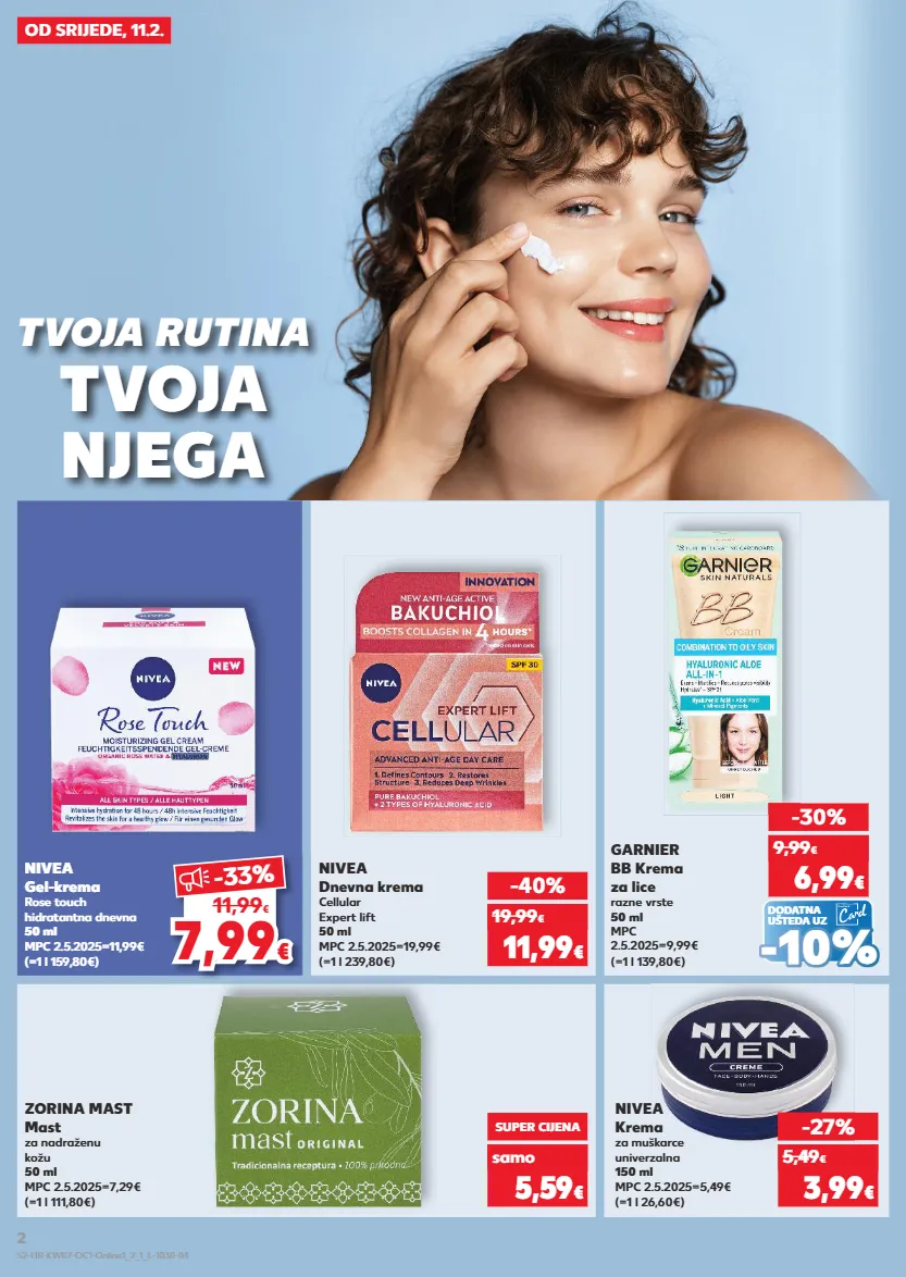 KRATKOTRAJNA PONUDA KRATKOTRAJNA PONUDA samo KRATKOTRAJNA PONUDA samo KRATKOTRAJNA PONUDA samo OD SRIJEDE, 11.2. ZORINA MAST Mast za nadraženu kožu 50 ml MPC 2.5.2025=7,29€ (=1 l 111,80€) samo SUPER CIJENA 5,59 € NIVEA Dnevna krema Cellular Expert lift 50 ml MPC 2.5.2025=19,99€ (=1 l 239,80€) -40% 11,99 € 19,99 € DODATNA UŠTEDA UZ (=1 l 139,80€) GARNIER BB Krema za lice razne vrste 50 ml MPC 2.5.2025=9,99€ -30% 6,99 € 9,99 € NIVEA Krema za muškarce univerzalna 150 ml MPC 2.5.2025=5,49€ (=1 l 26,60€) -27% 3,99 € 5,49 € - - 10% 10% NIVEA Gel-krema Rose touch hidratantna dnevna 50 ml MPC 2.5.2025=11,99€ (=1 l 159,80€) 7,99 7,99 € € -33 % 11,99 € TVOJA RUTINA TVOJA NJEGA S2-HR-KW07-OC1-Online1_2_1_L-1030-04 2
