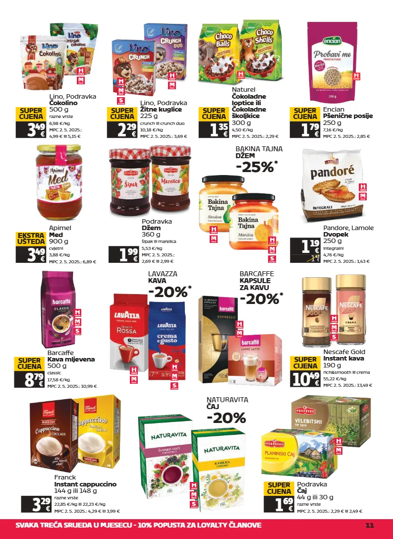 svaka treća srijeda u mjesecu - 10% popusta za loyalty članove 11 lino, podravka žitne kuglice 225 g crunch ili crunch duo 10,18 €/kg mpc 2. 5. 2025.: 3,69 € 2 29 super cijena 3 49 super cijena naturel čokoladne loptice ili čokoladne školjkice 300 g 4,50 €/kg mpc 2. 5. 2025.: 2,29 € 1 35 super cijena apimel med 900 g cvjetni 3,88 €/kg mpc 2. 5. 2025.: 6,89 € 3 49 ekstra ušteda bakina tajna džem -25% * podravka džem 360 g šipak ili marelica 5,53 €/kg mpc 2. 5. 2025.: 2,69 € ili 2,99 € 1 99 pandore, lamole dvopek 250 g integralni 4,76 €/kg mpc 2. 5. 2025.: 1,43 € 1 19 1 43 podravka čaj 44 g ili 30 g razne vrste mpc 2. 5. 2025.: 2,29 € ili 2,49 € 1 69 super cijena encian pšenične posije 250 g 7,16 €/kg mpc 2. 5. 2025.: 2,85 € 1 79 super cijena lino, podravka čokolino 500 g razne vrste 6,98 €/kg mpc 2. 5. 2025.: 4,99 € ili 5,15 € barcaffe kava mljevena 500 g classic 17,58 €/kg mpc 2. 5. 2025.: 10,99 € 8 79 super cijena nescafe gold instant kava 190 g rich&smooth ili crema 55,22 €/kg mpc 2. 5. 2025.: 13,49 € 10 49 super cijena lavazza kava -20% * barcaffe kapsule za kavu -20% * franck instant cappuccino 144 g ili 148 g razne vrste 22,85 €/kg ili 22,23 €/kg mpc 2. 5. 2025.: 4,29 € ili 3,99 € 3 29 naturavita čaj -20%