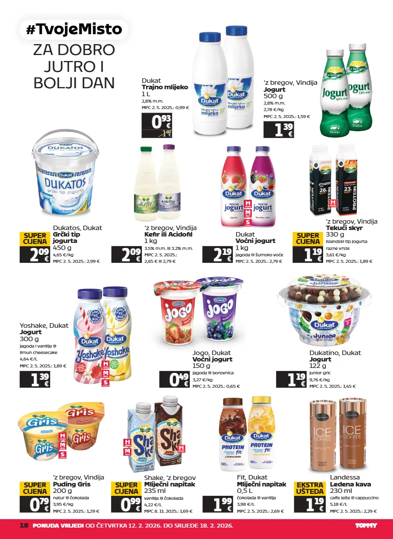 18 ponuda vrijedi od četvrtka 12. 2. 2026. do srijede 18. 2. 2026. za dobro jutro i bolji dan 0 93 1 02 dukat trajno mlijeko 1 l 2,8% m.m. mpc 2. 5. 2025.: 0,99 € dukat voćni jogurt 1 kg jagoda ili šumsko voće mpc 2. 5. 2025.: 2,79 € 2 19 dukatino, dukat jogurt 122 g junior gric 9,76 €/kg mpc 2. 5. 2025.: 1,45 € 1 19 yoshake, dukat jogurt 300 g jagoda i vanilija ili limun cheesecake 4,64 €/l mpc 2. 5. 2025.: 1,89 € 1 39 dukatos, dukat grčki tip jogurta 450 g 4,65 €/kg mpc 2. 5. 2025.: 2,99 € 2 09 super cijena ‘z bregov, vindija tekući skyr 330 g islandski tip jogurta razne vrste 3,61 €/kg mpc 2. 5. 2025.: 1,89 € 1 19 super cijena ‘z bregov, vindija puding gris 200 g natur ili čokolada 3,95 €/kg mpc 2. 5. 2025.: 1,29 € 0 79 super cijena 1 39 ‘z bregov, vindija jogurt 500 g 2,8% m.m. 2,78 €/kg mpc 2. 5. 2025.: 1,59 € jogo, dukat voćni jogurt 150 g jagoda ili borovnica 3,27 €/kg mpc 2. 5. 2025.: 0,65 € 0 49 ‘z bregov, vindija kefir ili acidofil 1 kg 3.5% m.m. ili 3.2% m.m. mpc 2. 5. 2025.: 2,65 € ili 2,79 € 2 09 shake, ‘z bregov mliječni napitak 235 ml vanilija ili čokolada 4,22 €/l mpc 8. 11. 2025.: 1,69 € 0 99 super cijena landessa ledena kava 230 ml caffe latte ili cappuccino 5,18 €/l mpc 2. 5. 2025.: 2,29 € 1 19 ekstra ušteda fit, dukat mliječni napitak 0,5 l čokolada ili vanilija 3,98 €/l mpc 2. 5. 2025.: 2,69 € 1 99