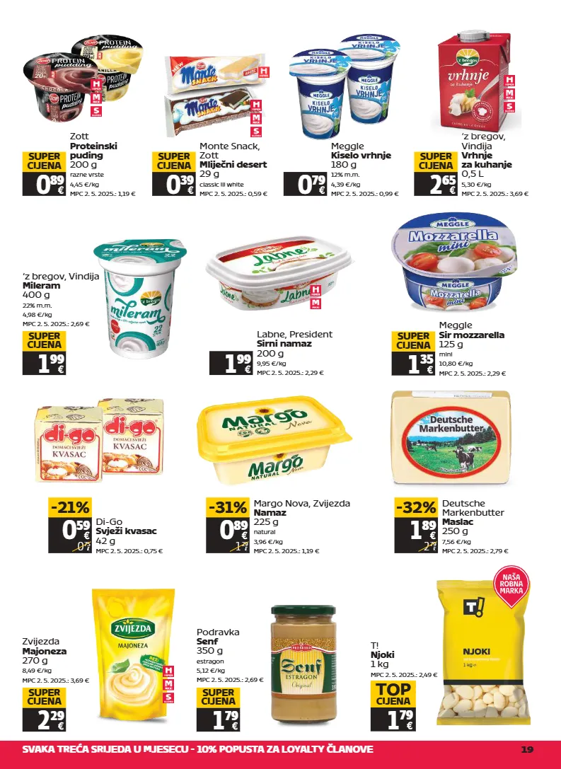 svaka treća srijeda u mjesecu - 10% popusta za loyalty članove 19 zott proteinski puding 200 g razne vrste 4,45 €/kg mpc 2. 5. 2025.: 1,19 € 0 89 super cijena labne, president sirni namaz 200 g 9,95 €/kg mpc 2. 5. 2025.: 2,29 € 1 99 ‘z bregov, vindija mileram 400 g 22% m.m. 4,98 €/kg mpc 2. 5. 2025.: 2,69 € 1 99 super cijena meggle sir mozzarella 125 g mini 10,80 €/kg mpc 2. 5. 2025.: 2,29 € 1 35 super cijena 1 89 2 79 -32% deutsche markenbutter maslac 250 g 7,56 €/kg mpc 2. 5. 2025.: 2,79 € zvijezda majoneza 270 g 8,49 €/kg mpc 2. 5. 2025.: 3,69 € 2 29 super cijena podravka senf 350 g estragon 5,12 €/kg mpc 2. 5. 2025.: 2,69 € 1 79 super cijena 0 79 meggle kiselo vrhnje 180 g 12% m.m. 4,39 €/kg mpc 2. 5. 2025.: 0,99 € ‘z bregov, vindija vrhnje za kuhanje 0,5 l 5,30 €/kg mpc 2. 5. 2025.: 3,69 € 2 65 super cijena 0 59 0 75 -21% di-go svježi kvasac 42 g mpc 2. 5. 2025.: 0,75 € t! njoki 1 kg mpc 2. 5. 2025.: 2,49 € 1 79 top cijena monte snack, zott mliječni desert 29 g classic ili white mpc 2. 5. 2025.: 0,59 € 0 39 super cijena 0 89 1 29 -31% margo nova, zvijezda namaz 225 g natural 3,96 €/kg mpc 2. 5. 2025.: 1,19 €
