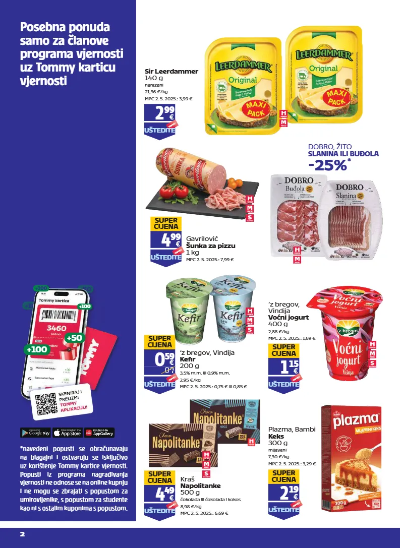 posebna ponuda samo za članove programa vjernosti uz tommy karticu vjernosti *navedeni popusti se obračunavaju na blagajni i ostvaruju se isključivo uz korištenje tommy kartice vjernosti. popusti iz programa nagrađivanja vjernosti ne odnose se na online kupnju i ne mogu se zbrajati s popustom za umirovljenike, s popustom za studente kao ni s ostalim kuponima s popustom. +50 +100 +100 +50 +100 +100 2 plazma, bambi keks 300 g mljeveni 7,30 €/kg mpc 2. 5. 2025.: 3,29 € uštedite super cijena 2 19 kraš napolitanke 500 g čokolada ili čokolada i kokos 8,98 €/kg mpc 2. 5. 2025.: 6,69 € uštedite super cijena 4 49 sir leerdammer 140 g narezani 21,36 €/kg mpc 2. 5. 2025.: 3,99 € uštedite 2 99 gavrilović šunka za pizzu 1 kg mpc 2. 5. 2025.: 7,99 € uštedite super cijena 4 99 dobro, žito slanina ili buđola -25% * ‘z bregov, vindija voćni jogurt 400 g 2,88 €/kg mpc 2. 5. 2025.: 1,69 € uštedite super cijena 1 15 0 75 uštedite 0 59 super cijena ‘z bregov, vindija kefir 200 g 3,5% m.m. ili 0,9% m.m. 2,95 €/kg mpc 2. 5. 2025.: 0,75 € ili 0,85 €