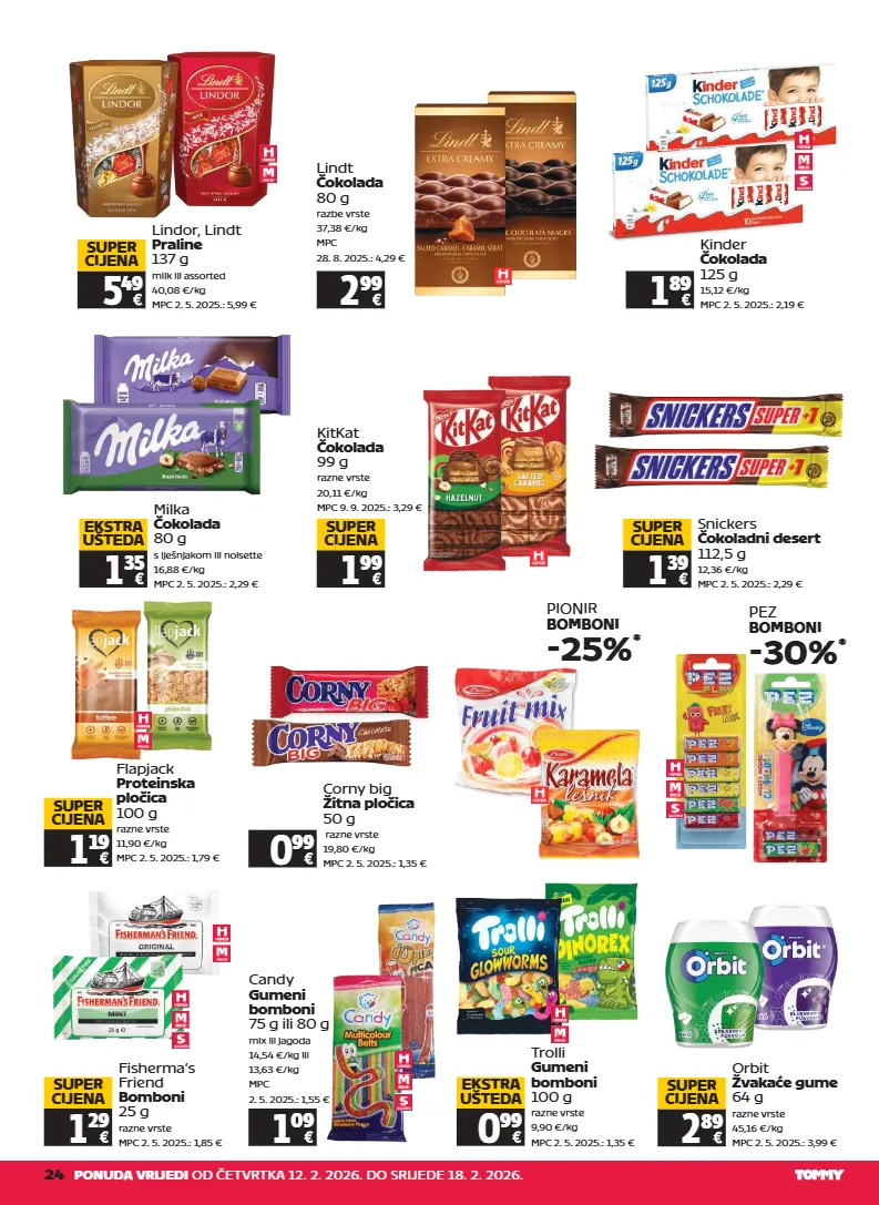 24 ponuda vrijedi od četvrtka 12. 2. 2026. do srijede 18. 2. 2026. lindor, lindt praline 137 g milk ili assorted 40,08 €/kg mpc 2. 5. 2025.: 5,99 € 5 49 super cijena corny big žitna pločica 50 g razne vrste 19,80 €/kg mpc 2. 5. 2025.: 1,35 € 0 99 snickers čokoladni desert 112,5 g 12,36 €/kg mpc 2. 5. 2025.: 2,29 € 1 39 super cijena milka čokolada 80 g s lješnjakom ili noisette 16,88 €/kg mpc 2. 5. 2025.: 2,29 € 1 35 ekstra ušteda fisherma’s friend bomboni 25 g razne vrste mpc 2. 5. 2025.: 1,85 € 1 29 super cijena trolli gumeni bomboni 100 g razne vrste 9,90 €/kg mpc 2. 5. 2025.: 1,35 € 0 99 ekstra ušteda orbit žvakaće gume 64 g razne vrste 45,16 €/kg mpc 2. 5. 2025.: 3,99 € 2 89 super cijena flapjack proteinska pločica 100 g razne vrste 11,90 €/kg mpc 2. 5. 2025.: 1,79 € 1 19 super cijena lindt čokolada 80 g razbe vrste 37,38 €/kg mpc 28. 8. 2025.: 4,29 € 2 99 kinder čokolada 125 g 15,12 €/kg mpc 2. 5. 2025.: 2,19 € 1 89 kitkat čokolada 99 g razne vrste 20,11 €/kg mpc 9. 9. 2025.: 3,29 € 1 99 super cijena pionir bomboni -25% * pez bomboni -30% * candy gumeni bomboni 75 g ili 80 g mix ili jagoda 14,54 €/kg ili 13,63 €/kg mpc 2. 5. 2025.: 1,55 € 1 09