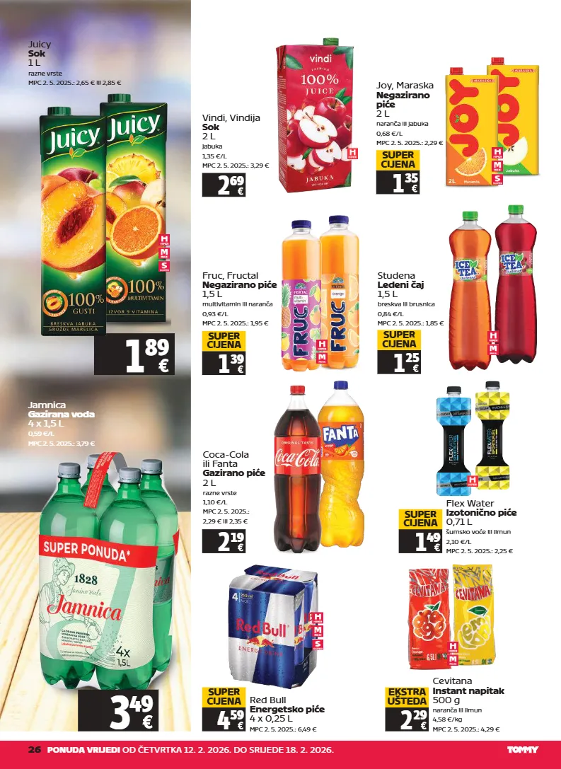 26 ponuda vrijedi od četvrtka 12. 2. 2026. do srijede 18. 2. 2026. vindi, vindija sok 2 l jabuka 1,35 €/l mpc 2. 5. 2025.: 3,29 € 2 69 juicy sok 1 l razne vrste mpc 2. 5. 2025.: 2,65 € ili 2,85 € joy, maraska negazirano piće 2 l naranča ili jabuka 0,68 €/l mpc 2. 5. 2025.: 2,29 € 1 35 super cijena studena ledeni čaj 1,5 l breskva ili brusnica 0,84 €/l mpc 2. 5. 2025.: 1,85 € 1 25 super cijena flex water izotonično piće 0,71 l šumsko voće ili limun 2,10 €/l mpc 2. 5. 2025.: 2,25 € 1 49 super cijena red bull energetsko piće 4 x 0,25 l mpc 2. 5. 2025.: 6,49 € 4 59 super cijena jamnica gazirana voda 4 x 1,5 l 0,59 €/l mpc 2. 5. 2025.: 3,79 € cevitana instant napitak 500 g naranča ili limun 4,58 €/kg mpc 2. 5. 2025.: 4,29 € 2 29 ekstra ušteda fruc, fructal negazirano piće 1,5 l multivitamin ili naranča 0,93 €/l mpc 2. 5. 2025.: 1,95 € 1 39 super cijena coca-cola ili fanta gazirano piće 2 l razne vrste 1,10 €/l mpc 2. 5. 2025.: 2,29 € ili 2,35 € 2 19 3 49 1 89