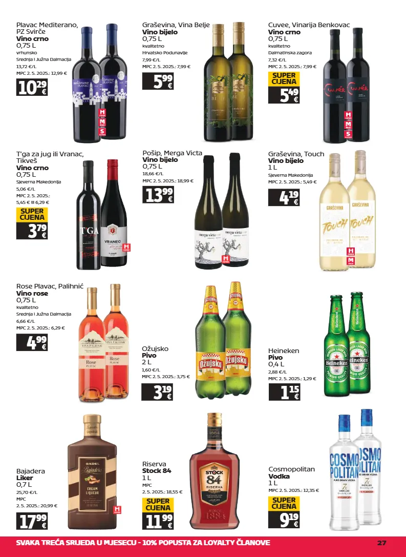 svaka treća srijeda u mjesecu - 10% popusta za loyalty članove 27 cuvee, vinarija benkovac vino crno 0,75 l kvalitetno dalmatinska zagora 7,32 €/l mpc 2. 5. 2025.: 7,99 € 5 49 super cijena t’ga za jug ili vranac, tikveš vino crno 0,75 l sjeverna makedonija 5,06 €/l mpc 2. 5. 2025.: 5,45 € ili 6,29 € 3 79 super cijena pošip, merga victa vino bijelo 0,75 l 18,66 €/l mpc 2. 5. 2025.: 18,99 € 13 99 plavac mediterano, pz svirče vino crno 0,75 l vrhunsko srednja i južna dalmacija 13,72 €/l mpc 2. 5. 2025.: 12,99 € 10 29 graševina, vina belje vino bijelo 0,75 l kvalitetno hrvatsko podunavlje 7,99 €/l mpc 2. 5. 2025.: 7,99 € 5 99 rose plavac, palihnić vino rose 0,75 l kvalitetno srednja i južna dalmacija 6,66 €/l mpc 2. 5. 2025.: 6,29 € 4 99 graševina, touch vino bijelo 1 l sjeverna makedonija mpc 2. 5. 2025.: 5,49 € 4 19 heineken pivo 0,4 l 2,88 €/l mpc 2. 5. 2025.: 1,29 € 1 15 ožujsko pivo 2 l 1,60 €/l mpc 2. 5. 2025.: 3,75 € 3 19 bajadera liker 0,7 l 25,70 €/l mpc 2. 5. 2025.: 20,99 € 17 99 riserva stock 84 1 l mpc 2. 5. 2025.: 18,55 € 11 99 super cijena cosmopolitan vodka 1 l mpc 2. 5. 2025.: 12,35 € 9 19 super cijena